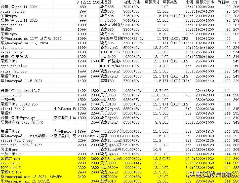 华为matepad air 12 2025星 | 3099 | 麒麟9010(推测) | 10100+66w | 12 | LCD | 3:2 | 2800*1840 | 144 | 280 | |