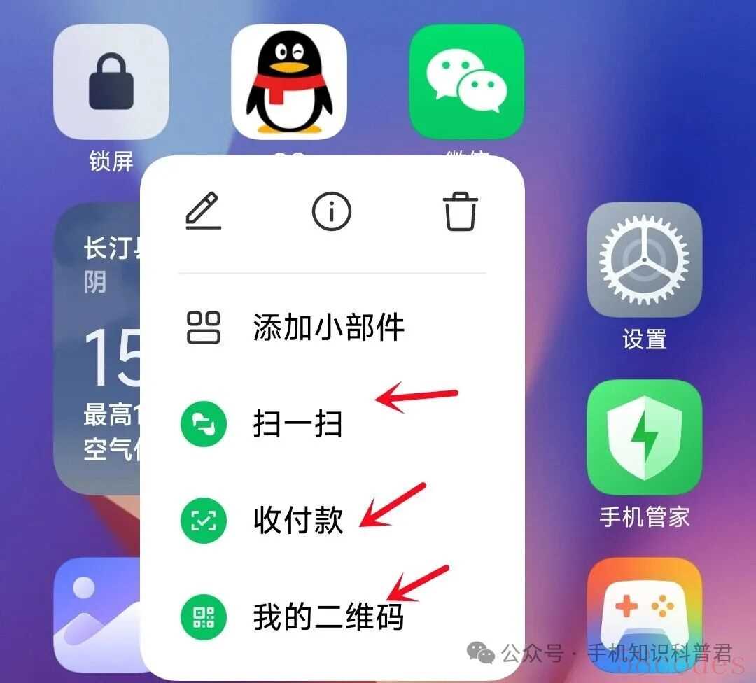 你在使用微信收付款的时候,是不是还在打开微信,点服务,找钱包,然后选择收付款又或者说,别人在添加你好友的时候,你是不是还在进入微信页面,找到自己的二维码,然后让别人扫描添加呢?其实,我们只要在桌面上长按微信图标2秒,接着就会出现【扫一扫】【我的二维码】等功能,我们只要点击扫一扫,就可以快速收付款,以及添加我的二维码,别人就可以快速扫描添加我们为好友,全程不用打开微信,既省时又省力!