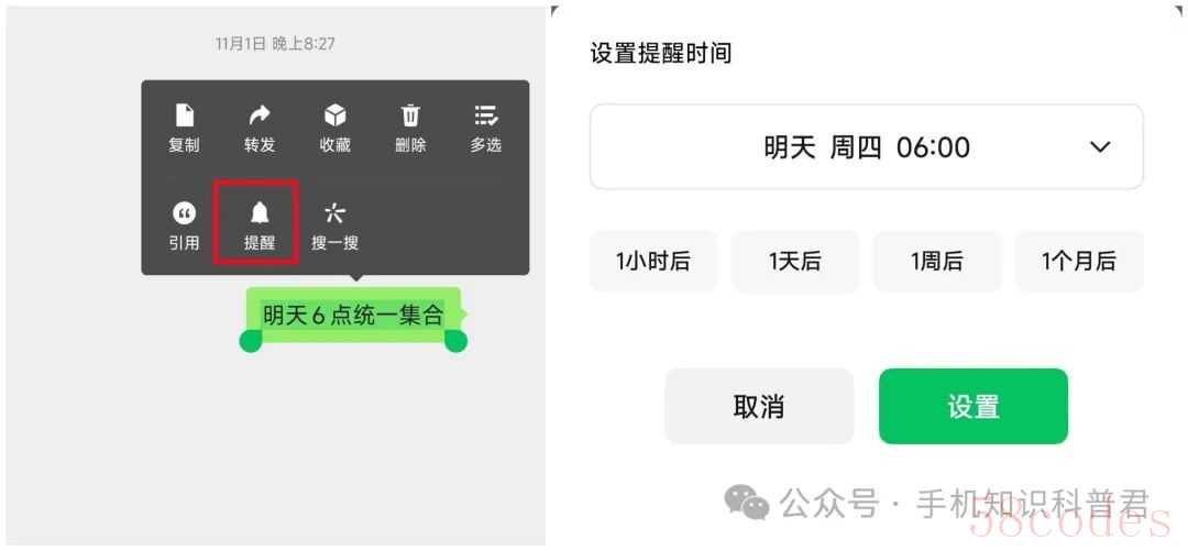 空白的对话框,藏着让你不再忘事的神技。• 设置提醒:公司搞团建,怕忘记具体时间,朋友约你晚上吃饭,看到消息时正在忙,你是不是经常遇到这样的情况!心里回了,但手上没动,然后...就忘了!此时我们长按这条消息选“提醒”,设置个时间,比如一小时后,或者具体的时间,到时候微信会像闹钟一样弹出来提醒你!自从用了这个功能,从此我再也没有错过重要约会!!!