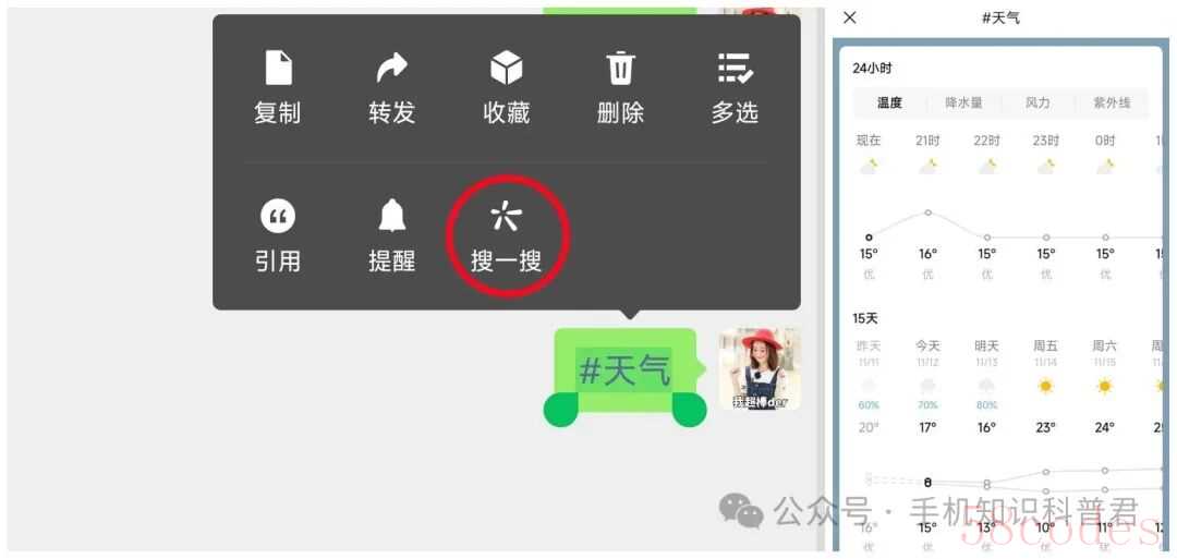 • 搜索直达:微信导航仪:外出旅行,想知道那边的天气实时状态,此时在文本框发送【#天气】,长按选择搜一搜,当地的天气状况清晰展现在你眼前!