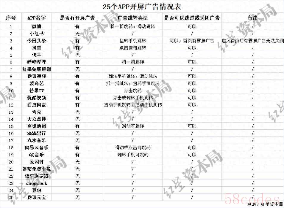 为保证测试的准确性,红星资本局在近几日多次打开上述25个App并记录相关情况,有的App每天每次打开都有开屏广告,有的App只在某一天的第一次打开时有开屏广告。具体情况如图所示: