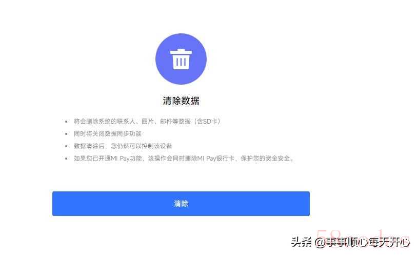 清除数据:将会删除系统的联系人、图片、邮件等数据(含SD卡)。同时将关闭数据同步功能。数据清除后,您仍然可以控制该设备。如果您已经开通MI Pay 功能,该操作会同时删除银行卡,保护您的资金安全。
