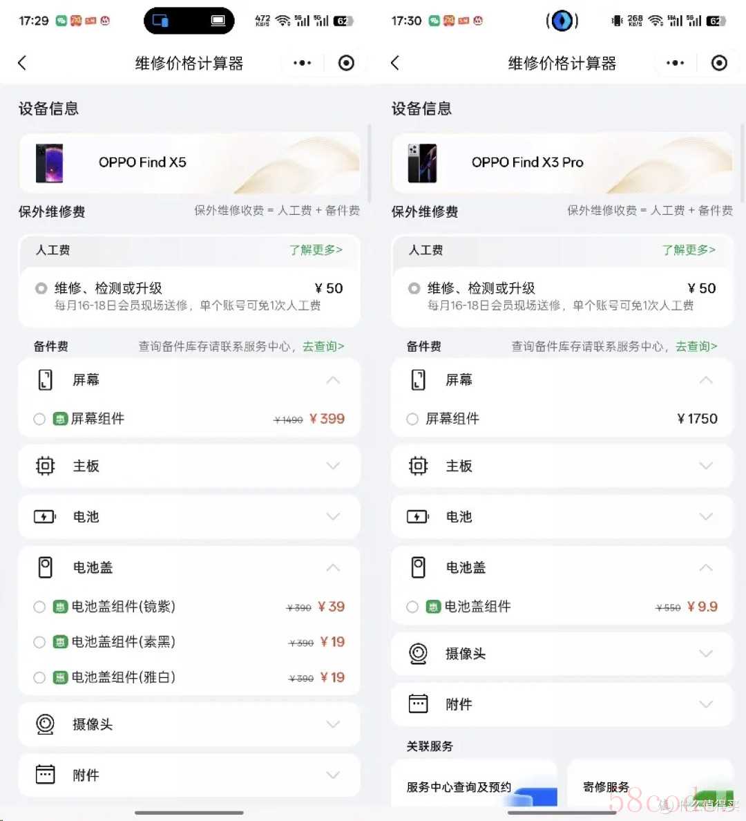 - 后盖更换9.9元起:OPPO Reno 6 Pro、Find X3等老机型,换配色或修刮花只要9.9-19.9元,比原价省200+;