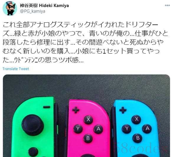 在推文中,神谷英树晒出三只任天堂当家掌机Switch所配套的JOYCON游戏手柄,并称“全都因为摇杆漂移坏掉了”,其中“绿色的和红色的是小女儿的,蓝色的是自己的”,原本神谷英树打算等工作轻松点再送去修理的,但又感觉“玩不到游戏就会死”,所以买了新的,也给小女儿新买了一套。这让他“感觉非常讨厌”。