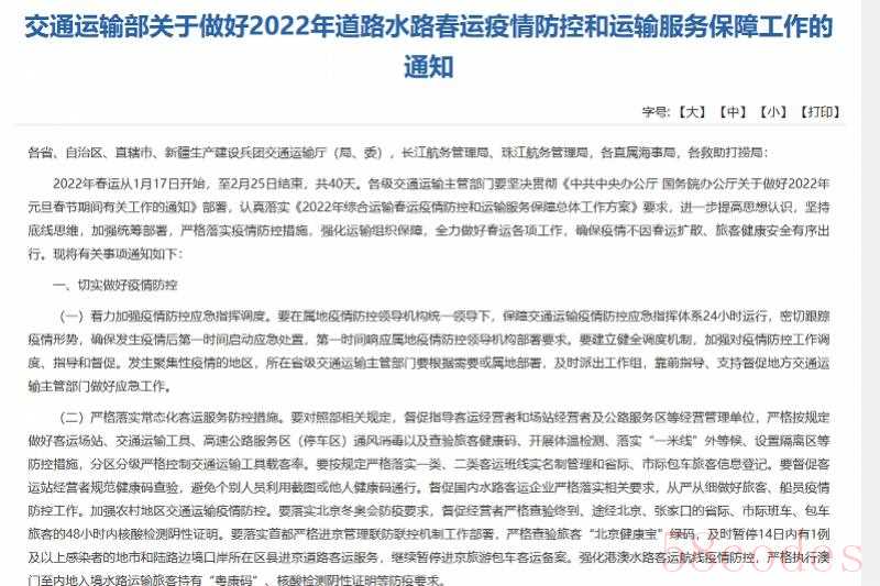 2022年春运从1月17日开始,至2月25日结束,共40天。交通运输部官网1月17日发布《关于做好2022年道路水路春运疫情防控和运输服务保障工作的通知》,其中提到,在疫情防控方面,要切实强化进出中高风险地区客运管控,在中高风险地区风险等级下调前,原则上暂停进出中高风险地区所在县级行政区域内的省际、市际道路客运和跨城公交。有中高风险地区的城市原则上应当暂停出租汽车(含巡游车、网约车)、顺风车的跨城业务和城市内的拼车业务。