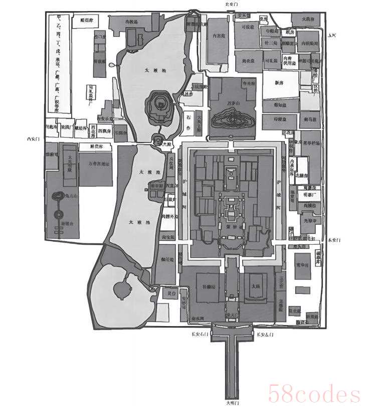 明初承袭南京之制,把北京的宫城和禁垣统称“皇城”。明神宗万历朝重修《大明会典》,把宫城改称“紫禁城”,把禁垣称为“皇城”,这样才把二者区分开。在皇城的位置稍稍向南和东作了偏移后,不可移动的太液池当然就从元皇城的正中心,微微向西做了位移,变成了与紫禁城并列于明皇城的正中间。但仍然保持未变的是,琼华岛依旧处在整个明皇城的核心部位。