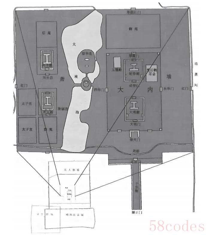 皇城里位置居中的不是宫城,而是皇家御苑太液池。修建皇城时特意开凿了一条专用水道,把西北郊的玉泉山水引入湖中,以保证湖中永远清水涟漪,水波荡漾。宫殿建筑有四大群,分别建在太液池的东西两岸。位于东岸的是宫城,位于西岸的是兴圣宫、隆福宫和太子宫。东岸的宫城是正宫,位置略偏南,正对棂星门。西岸的三大宫殿群以兴圣宫居北,主要供皇后、嫔妃居住;隆福宫、太子宫居南,前者主要供太后居住,后者主要供太子居住。女性在蒙古族中的地位高于汉族女性,皇后可与皇帝并坐临朝,后妃亦可单独占据一两个宫区,所以元大都皇城就形成了以太液池为中心、四大宫分列两岸的格局。