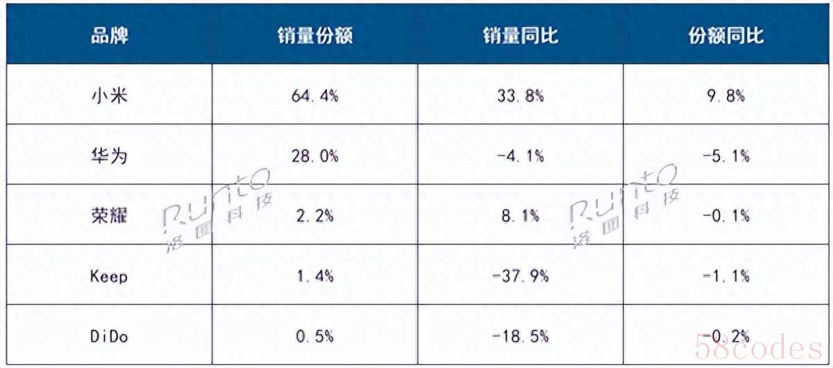 洛图科技公开的TOP5品牌中,小米、华为位居冠亚军宝座,而荣耀、Keep和DiDo则位列后三名。尽管荣耀排名第三,但销售份额仅2.2%,与第二名的华为差距较大。