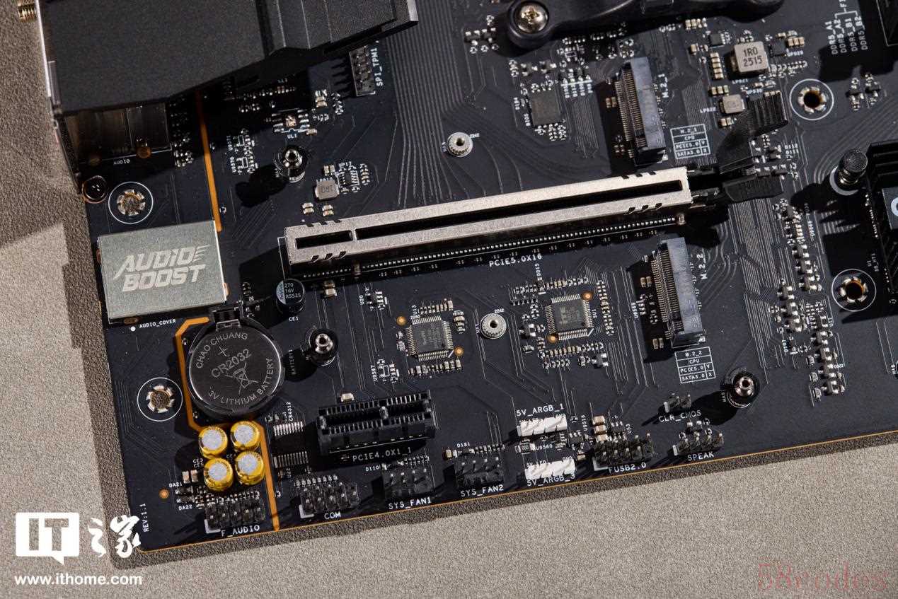 CPU 下方提供 1 条带有铝合金加固的 PCIe 5.0x16 显卡插槽,上下各有 1 条 PCIe5.0 M.2 插槽,再下方还有 1 条 PCIe 4.0x1 插槽,支持连接声卡等扩展件。右侧最下方还有第 3 条 PCIe 4.0 规格的 M.2 插槽,同时还保留了 4 个 SATA 接口,存储扩展性到位。