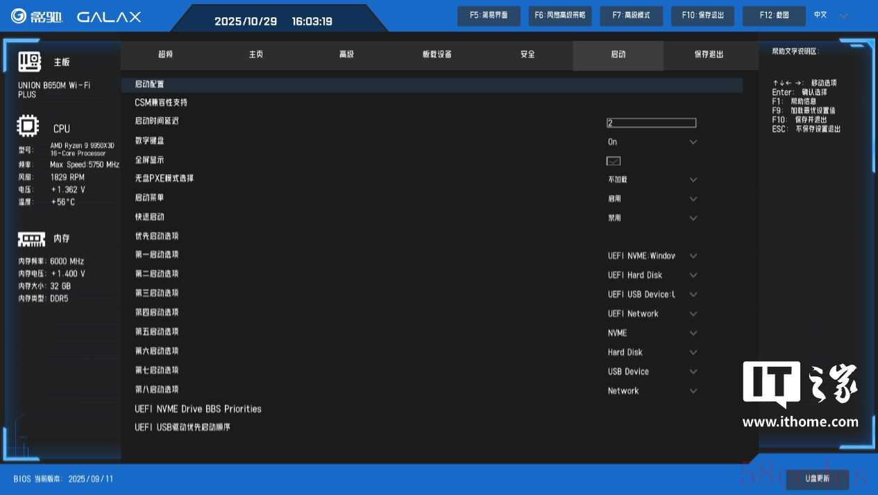 启动选项下,有基础的设备启动顺序切换,也有启动时间延迟、启动菜单和快捷启动等设置的开关选项。六、总结从型号上看,影驰联盟 B650M Wi-Fi 黑武士 PLUS 主板并非最新一代 AMD 中端主板平台,但影驰在主板用料上采用“量大管饱”的策略,给到了 12+2+1 相 60A 强化供电、3 个 M.2 接口(2*PCIe5.0+1*PCIe4.0),7600+ OC 内存频率支持、Debug 纠错灯以及 Wi-Fi 6+2.5G 双网卡等配置,让其拥有了非常强的 CPU 兼容性、性能释放能力以及扩展性,主流用户买来搭配最新的锐龙 9000 系旗舰处理器,也可以发挥出其应有的实力。