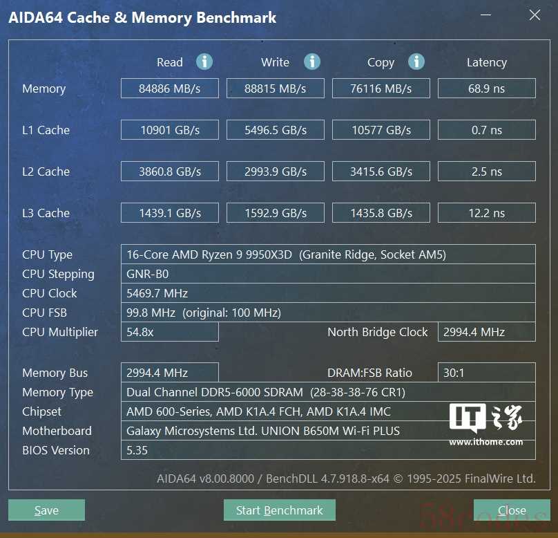 内存方面,由于影驰联盟 B650M Wi-Fi 黑武士 PLUS 主板的 BIOS 中提供了 XMP/EXPO 超频功能和高带宽 + 低延迟选项开关,我们直接通过 AIDA64 看下内存性能的表现。首先是默频模式,AIDA64 显示的内存时序为 40-39-39-77 CR1,此时: