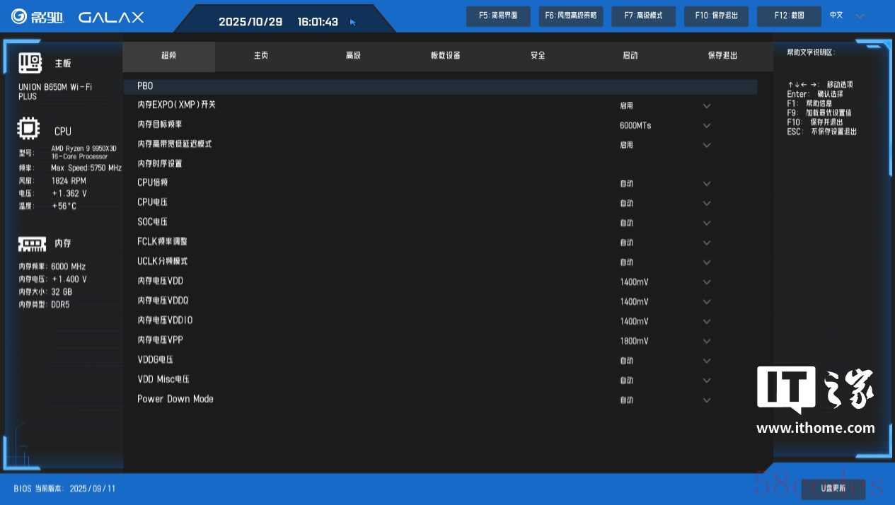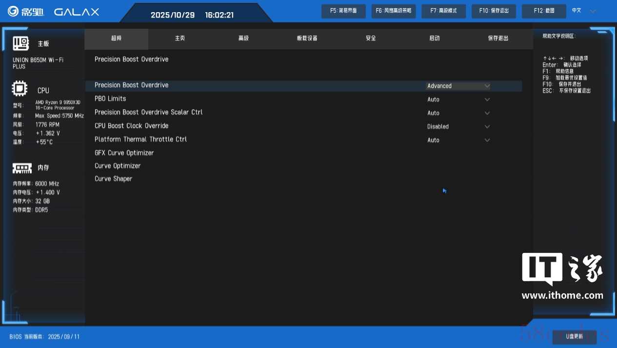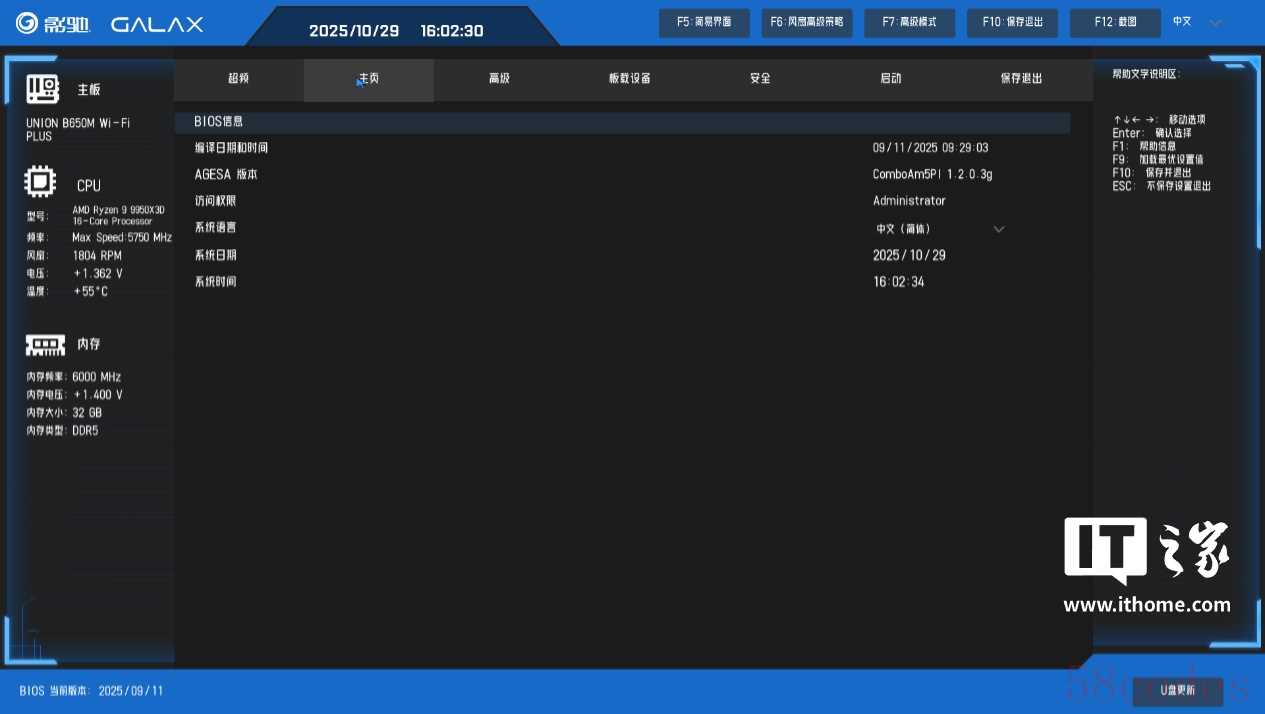 最后一款游戏《黑神话:》,以 1080P + 高画质 + 100% TSR 设置,运行游戏自带的基准测试,游戏平均帧数轻松来到 162 帧。五、BIOS 体验影驰联盟 B650M Wi-Fi 黑武士 PLUS 主板的 BIOS 可视化界面,采用了蓝黑撞色设计,背景主色调是黑色,蓝色则是强调色,文字采用白色,整体的视觉可读性不错,UI 也比较简约。