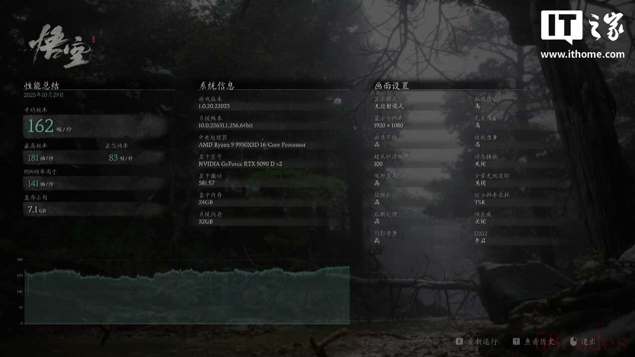 在硬件性能负载压力非常大的《赛博朋克:2077》中,选择 1080P 分辨率 + 超级画质预设,运行游戏自带基准测试,游戏平均帧数为 226 帧。6、《黑神话:》