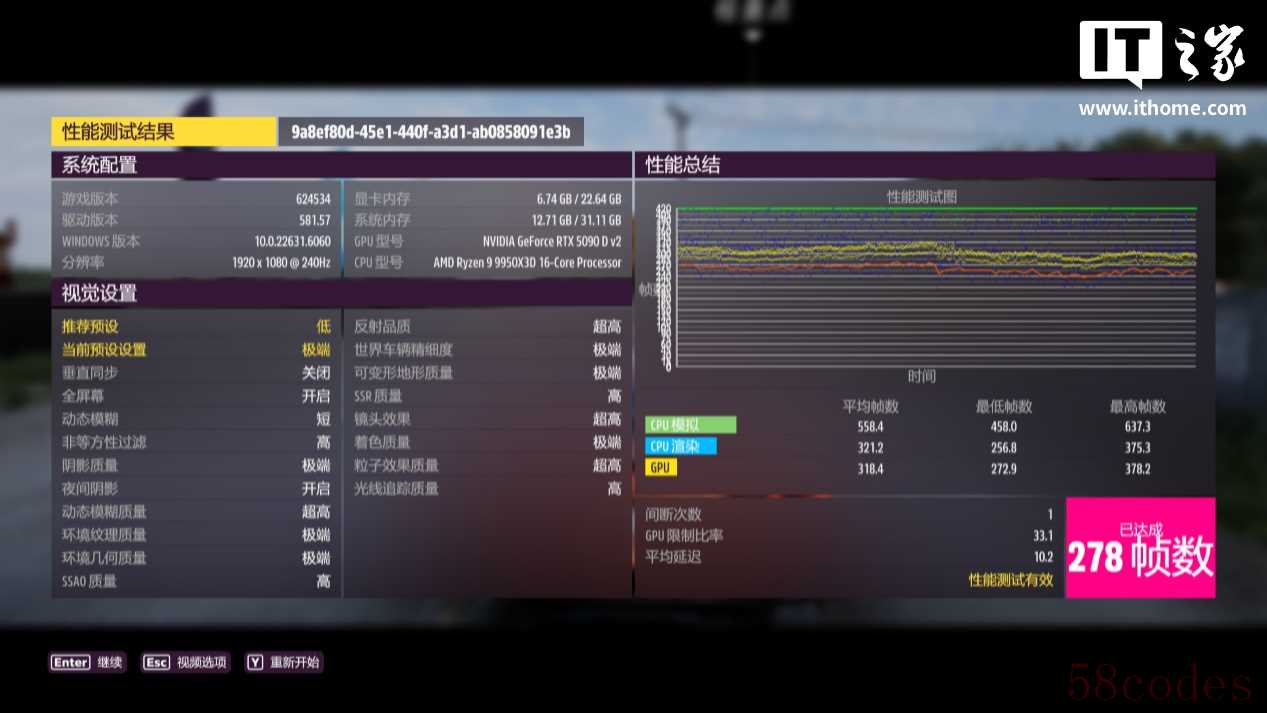 第四款游戏《极限竞速:地平线 5》,以 1080P 分辨率 + 极端画质预设,运行游戏自带基准测试,游戏平均帧数为 278 帧。5、《赛博朋克:2077》