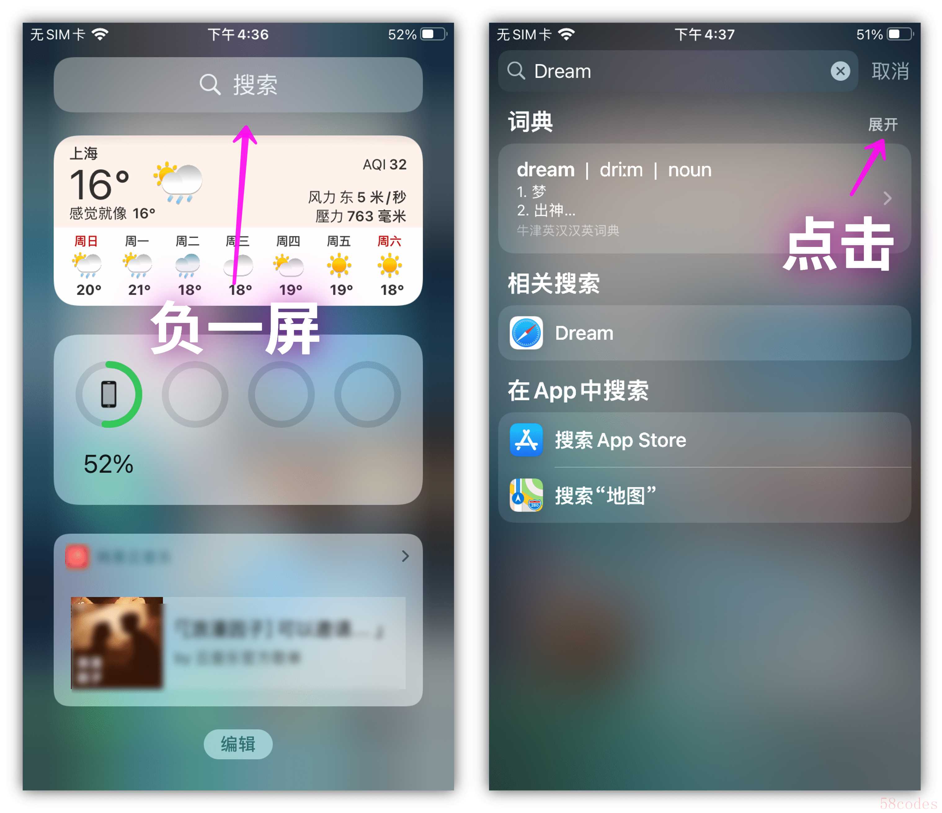 1.当我们遇到不认识的英语单词,直接滑动到苹果手机的负一屏,上方有个搜索框,在里面输入单词,随后就会出现翻译结果了。