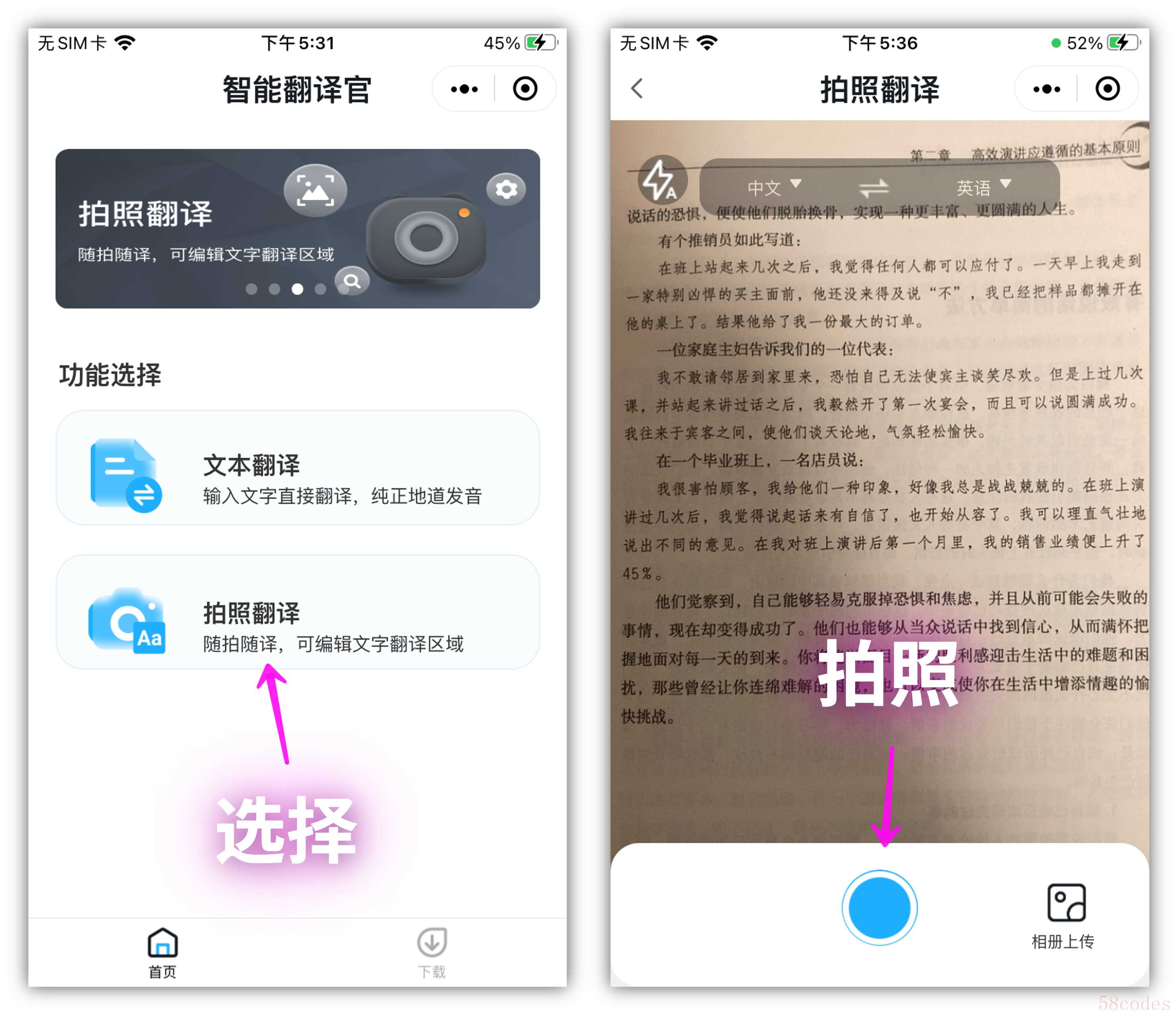 1.当我们在工作中,需要翻译长篇文档,可以打开微信小程序,找到智能翻译官APP,选择【拍照翻译】功能,将文稿内容拍下来。
