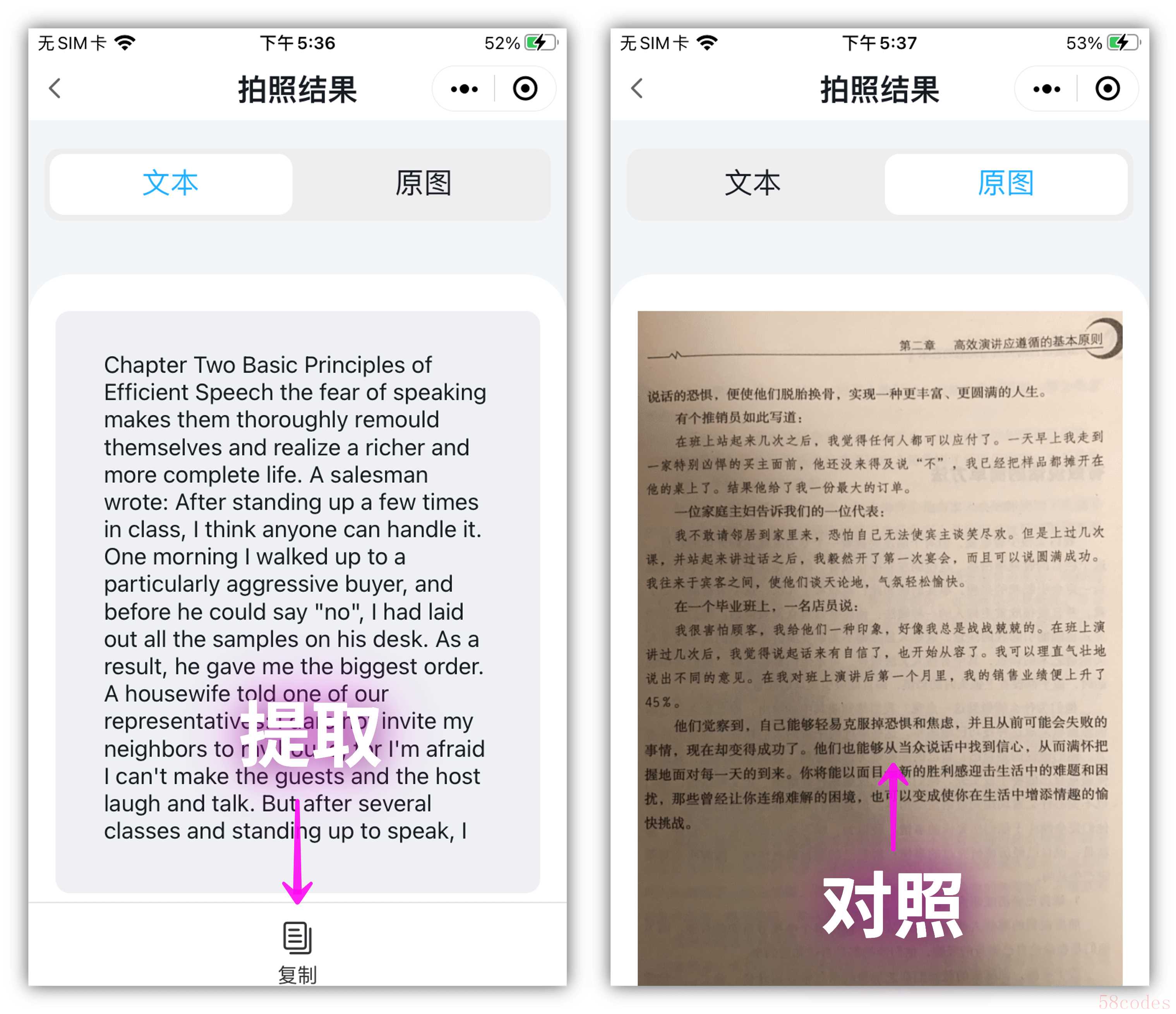 2.只需1秒就能翻译出结果了,整篇文稿被翻译成英文,点击底部的【复制】,即可提取出来,还能查看原图对照,便于及时修改。