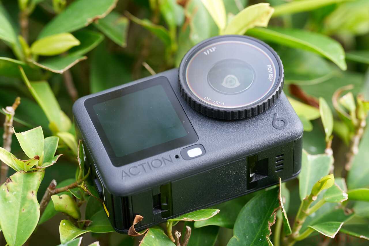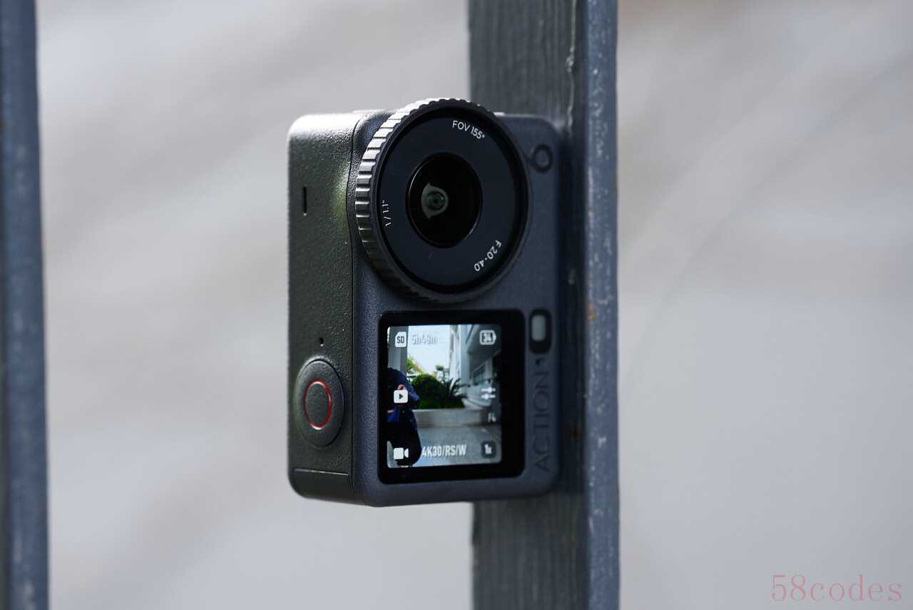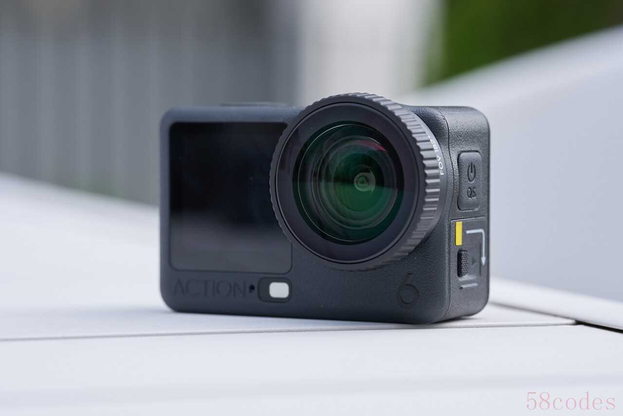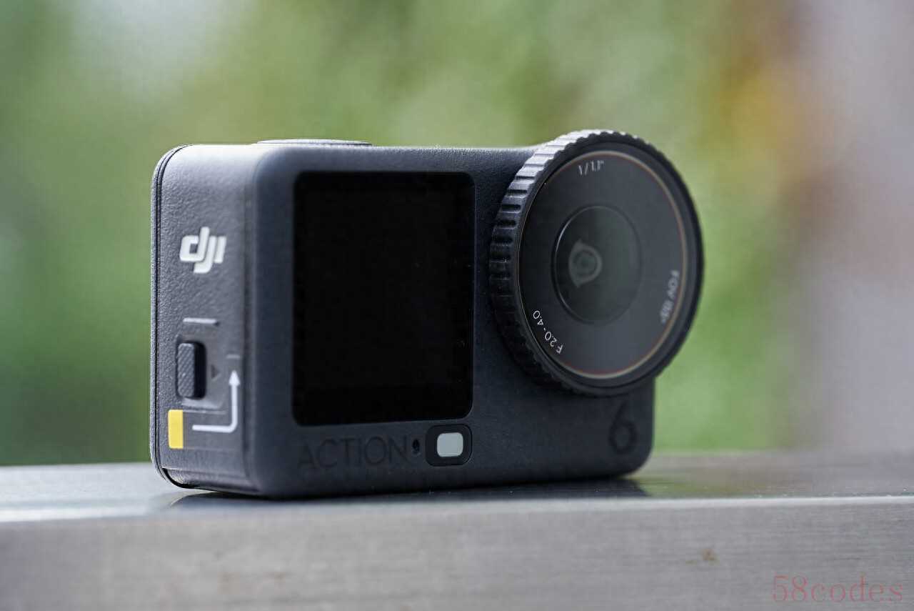 而另一个比较明显的升级点便是镜头,Action 系列历代产品都会在镜头保护罩上标注基本参数,例如传感器尺寸、可拍摄角度以及固定光圈数值。因此当我刚拿到Action 6时就发现光圈数值居然标注的是F2.0-4.0,这意味着它拥有可变光圈技术。