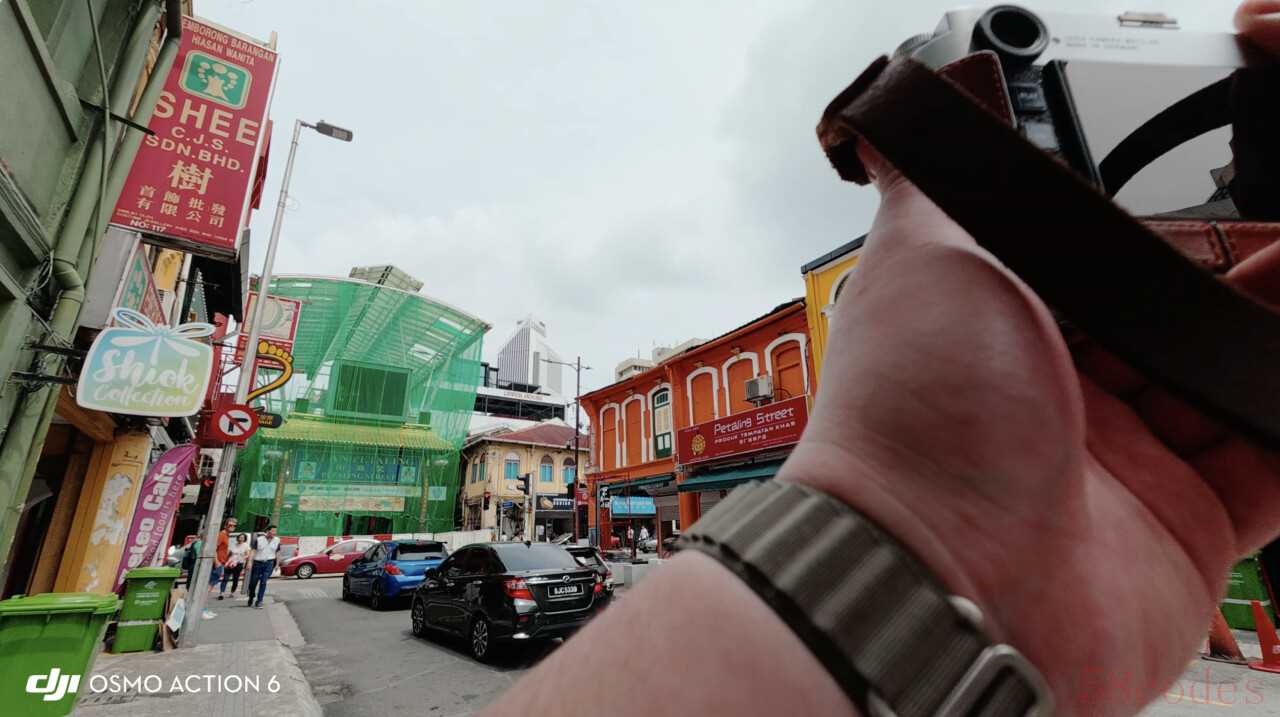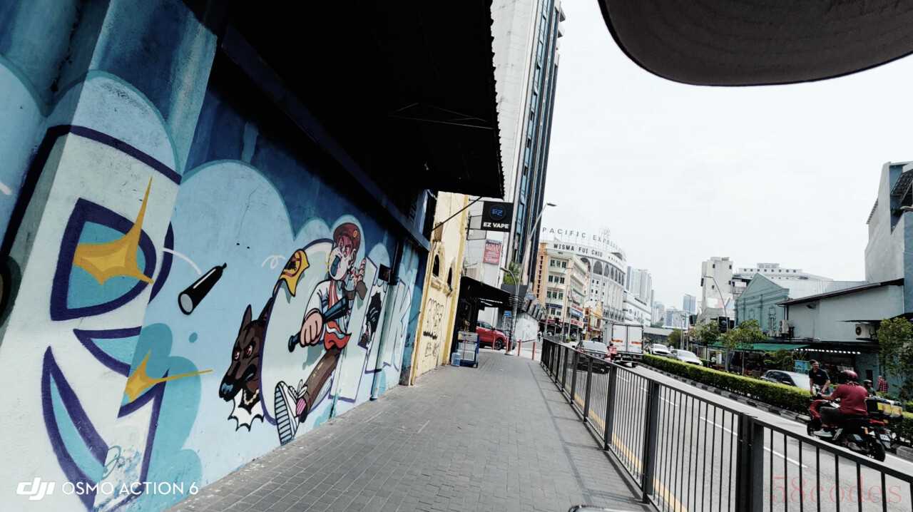 首先是日常的白天场景,吉隆坡当天的天气并不算好,光线也不是特别充足,导致整个天空部分完全过曝,但这并没有影响到整体画面的色调,从画面中可以看到整体的色彩表现非常棒,且街道和墙上的涂鸦色彩也十分讨喜,再加上大疆强大的防抖功能,让整个画面看起来都非常舒服。