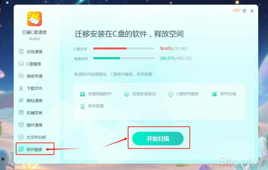https://clean.baishasoft.com/)的 “软件搬家” 功能支持识别C盘已安装软件,一键迁移至其他磁盘,且提供 “软件压缩”“软件卸载” 辅助功能,操作流程如下: