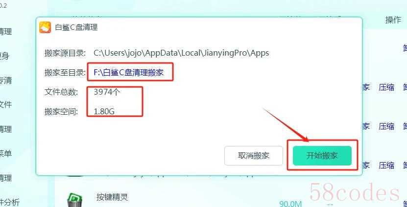 点击搬家按钮后,弹窗窗口,显示原安装路径,搬家目录,文件数量,以及搬家需要的空间。