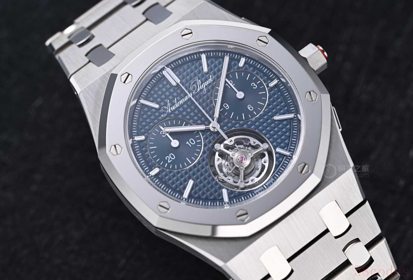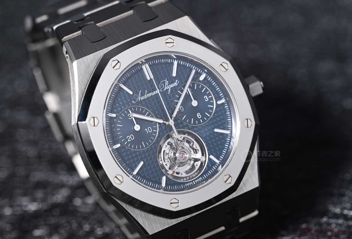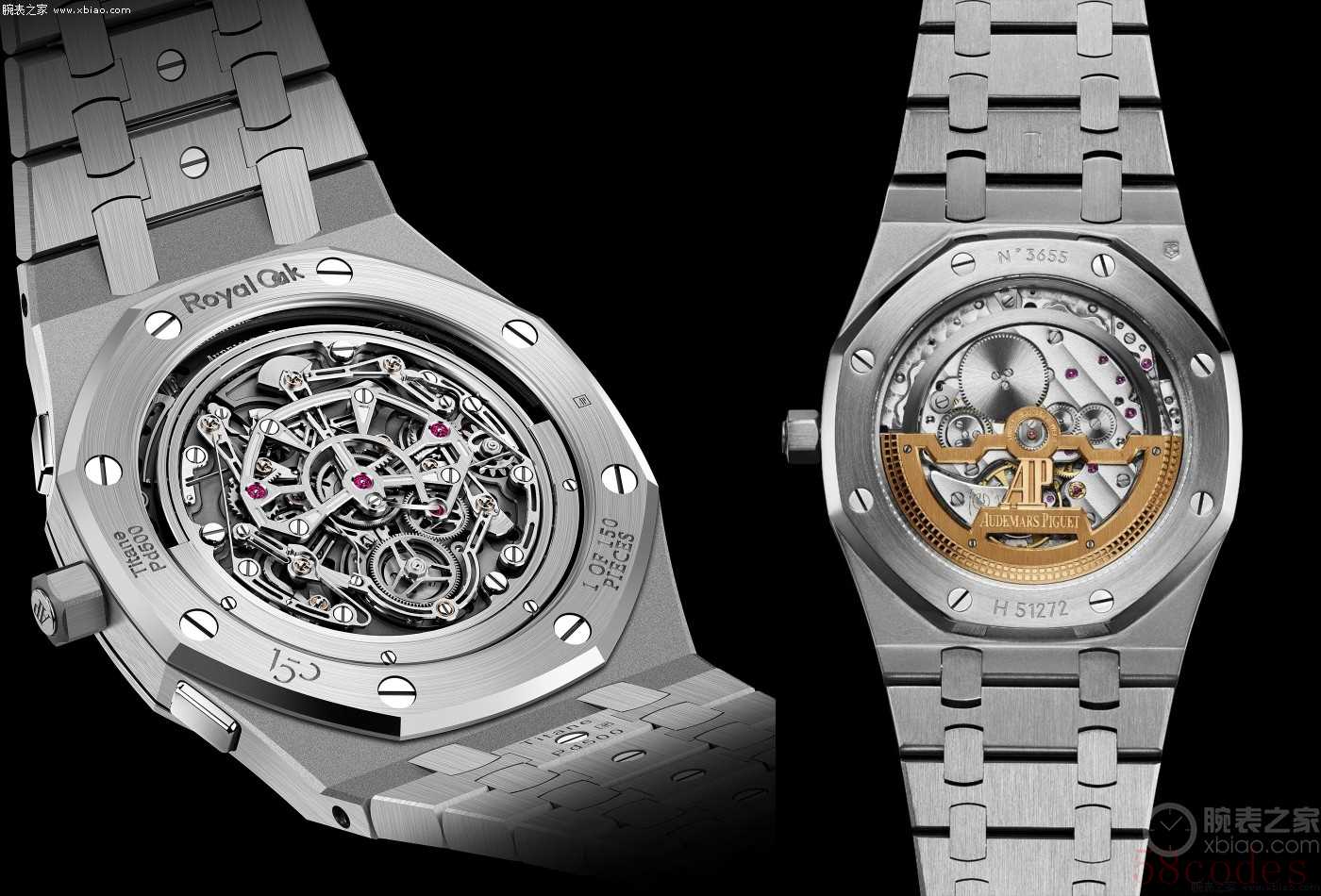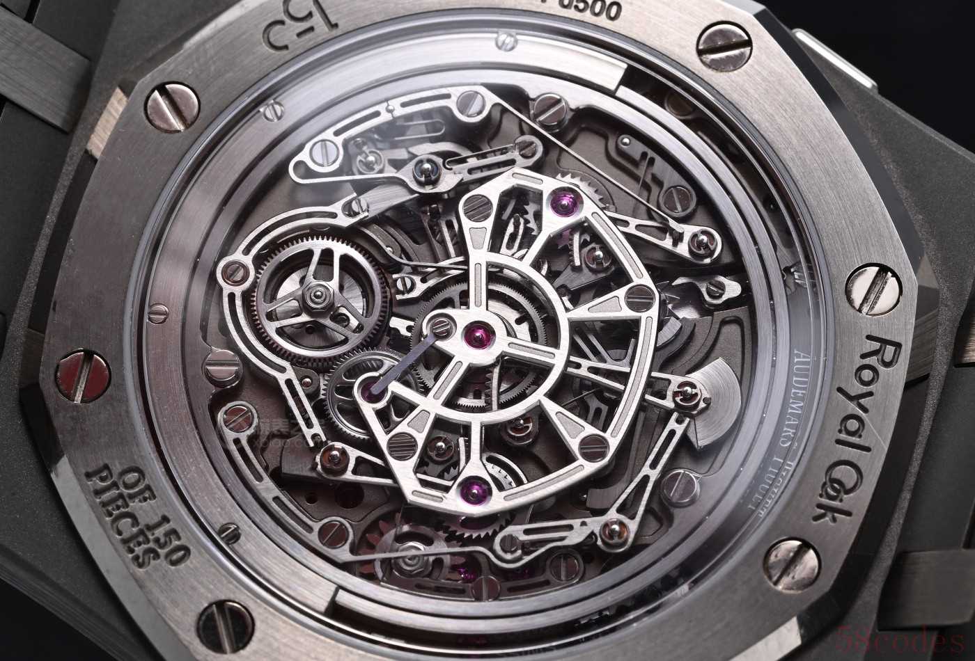 这就是全球限量150枚的Royal Oak皇家橡树系列“Jumbo”自动上链浮动式陀飞轮超薄计时码表RD#5,纯粹是爱彼展示制表实力的炫技之作!