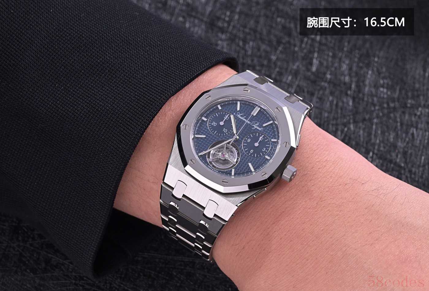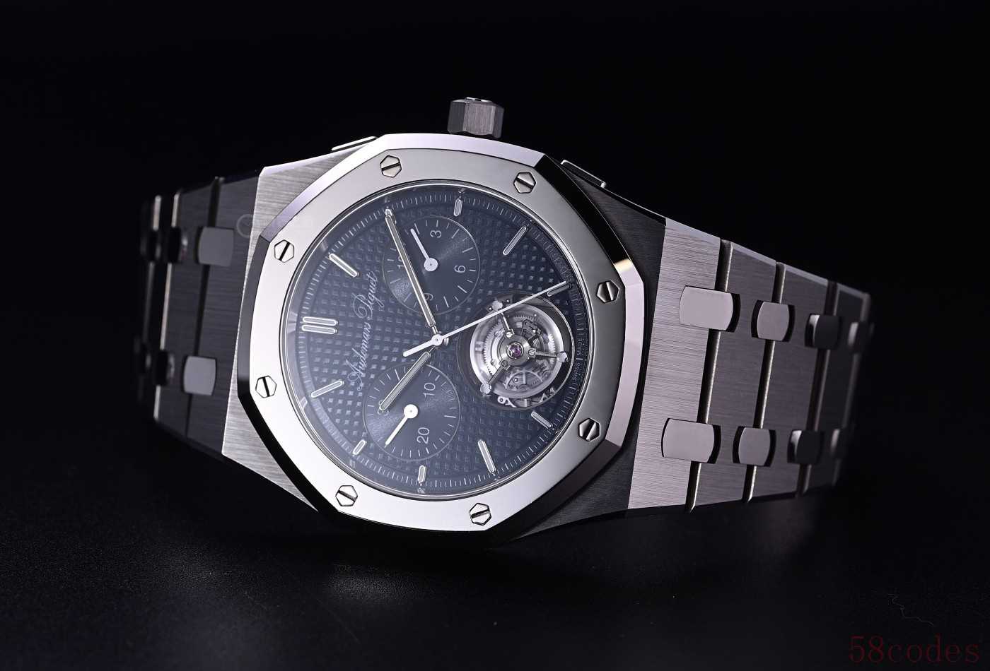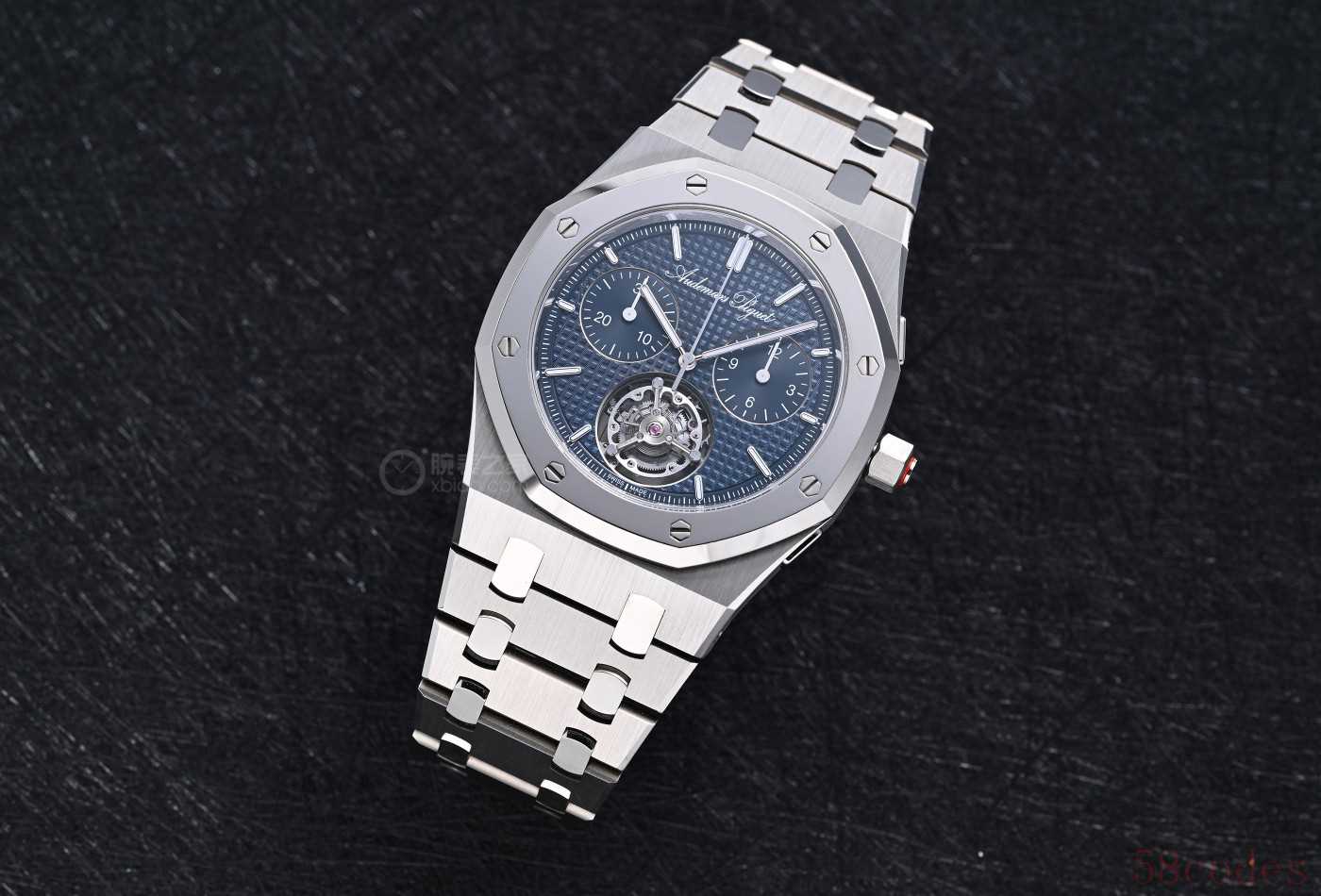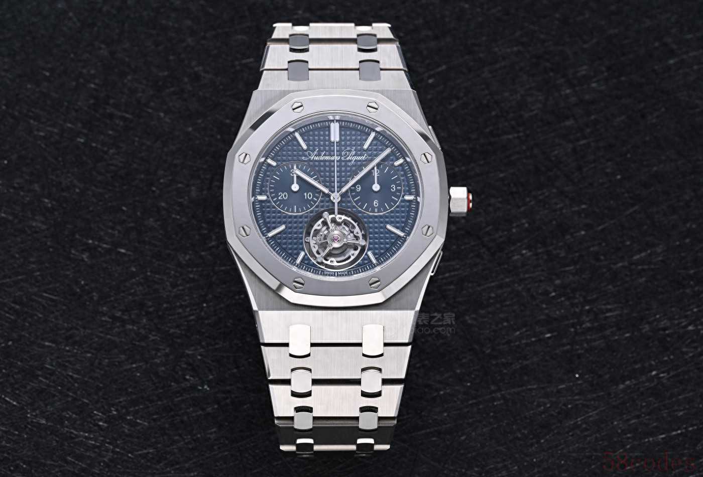 这就是全球限量150枚的Royal Oak皇家橡树系列“Jumbo”自动上链浮动式陀飞轮超薄计时码表RD#5,纯粹是爱彼展示制表实力的炫技之作!
