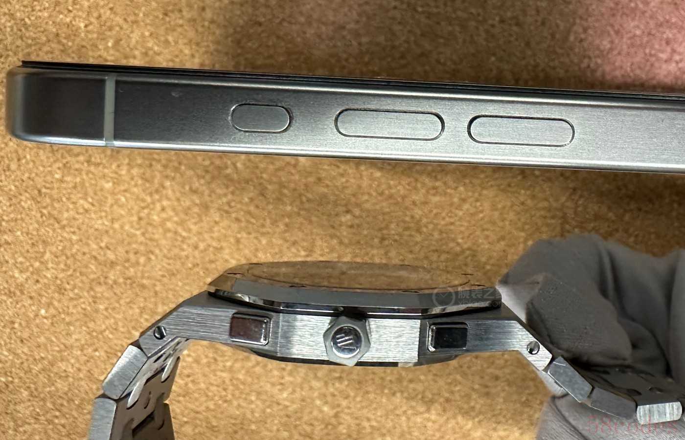 而爱彼想要达到的手感目标是让计时按钮操作力度,比普通计时表小10到25倍,同时连按下按钮的行程都做得更短。最终RD#5做到了按动约0.3毫米的按钮行程,只需要300克的力就能轻松启动。为了让大家直观感受,爱彼还举了个最容易被感知的例子,RD计划的制表师们,直接以智能手机的按键手感当模板。各位现在就能拿起手机试试,按一下侧边的按键,手感真的跟RD#5的计时按钮几乎没差别。