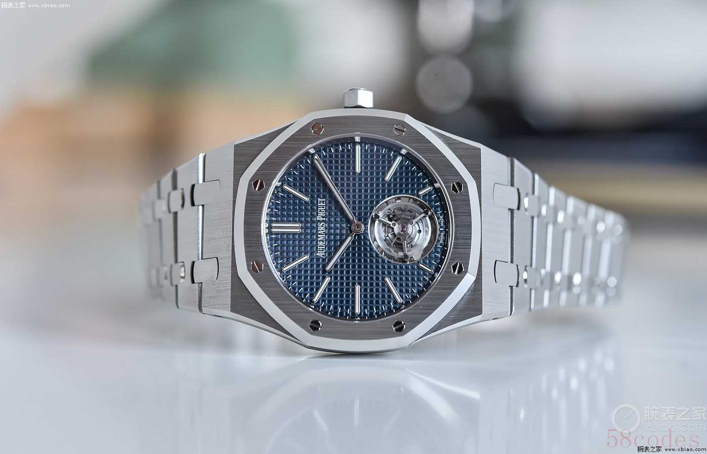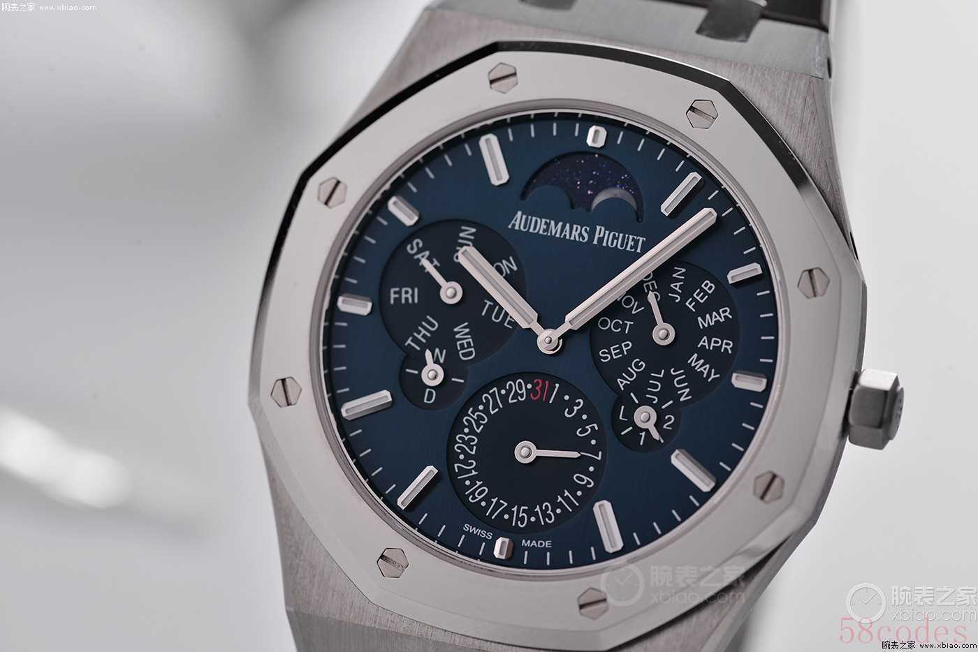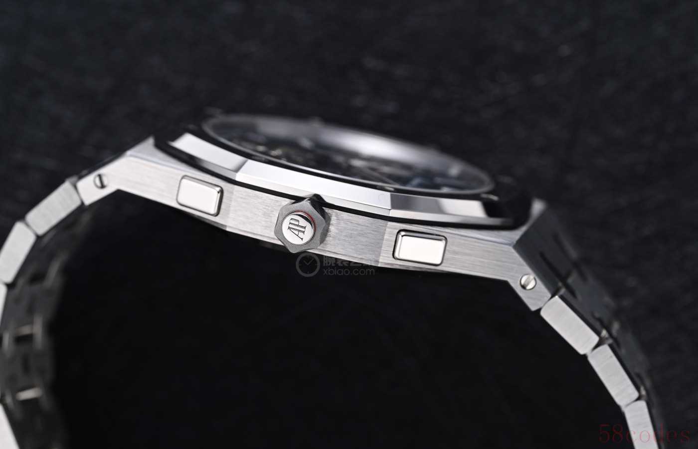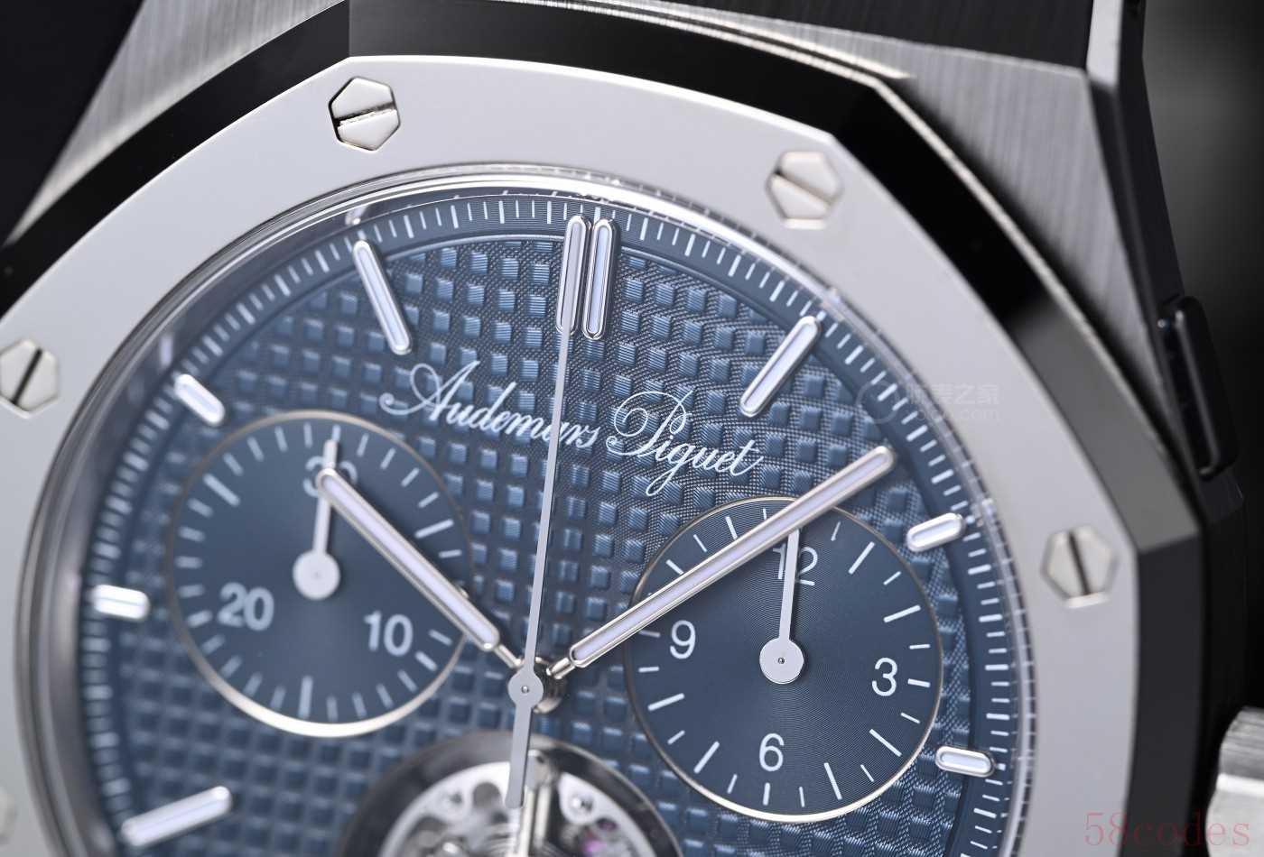 在“夜色蓝,云50”盘面,也就是爱彼最经典的蓝色格纹盘面上,花写体AP LOGO特别显眼,能用上这种复古花体字的爱彼,就是不一般的爱彼。