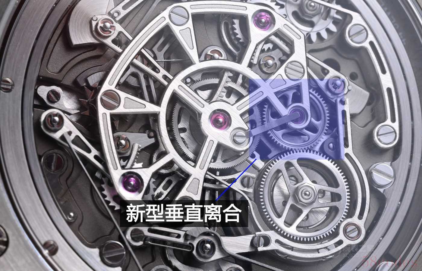而第二种全新计时构造,是新型垂直离合。计时表中常见的离合结构,基本上就三种,水平离合、垂直离合还有一个摆动齿轮,但摆动齿轮实际上跟水平离合有点类似,我们只说前面两种。