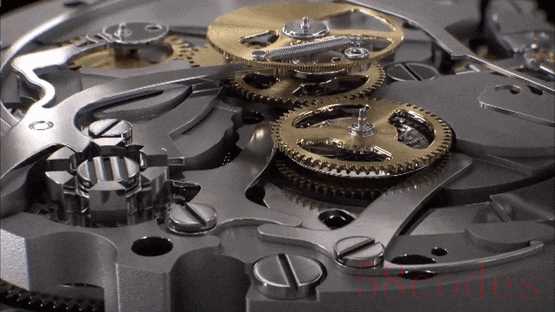水平离合,从演示动图里能看得很清楚,按一下计时按钮,离合轮就推过去了,将走时跟计时的两个齿轮,通过齿牙互相啮合。而不需要计时的时候,再按下停止跟归零,这一步是离,离合轮回到原位,一推一退,一离一合,这就是水平离合最基础的运行模式。