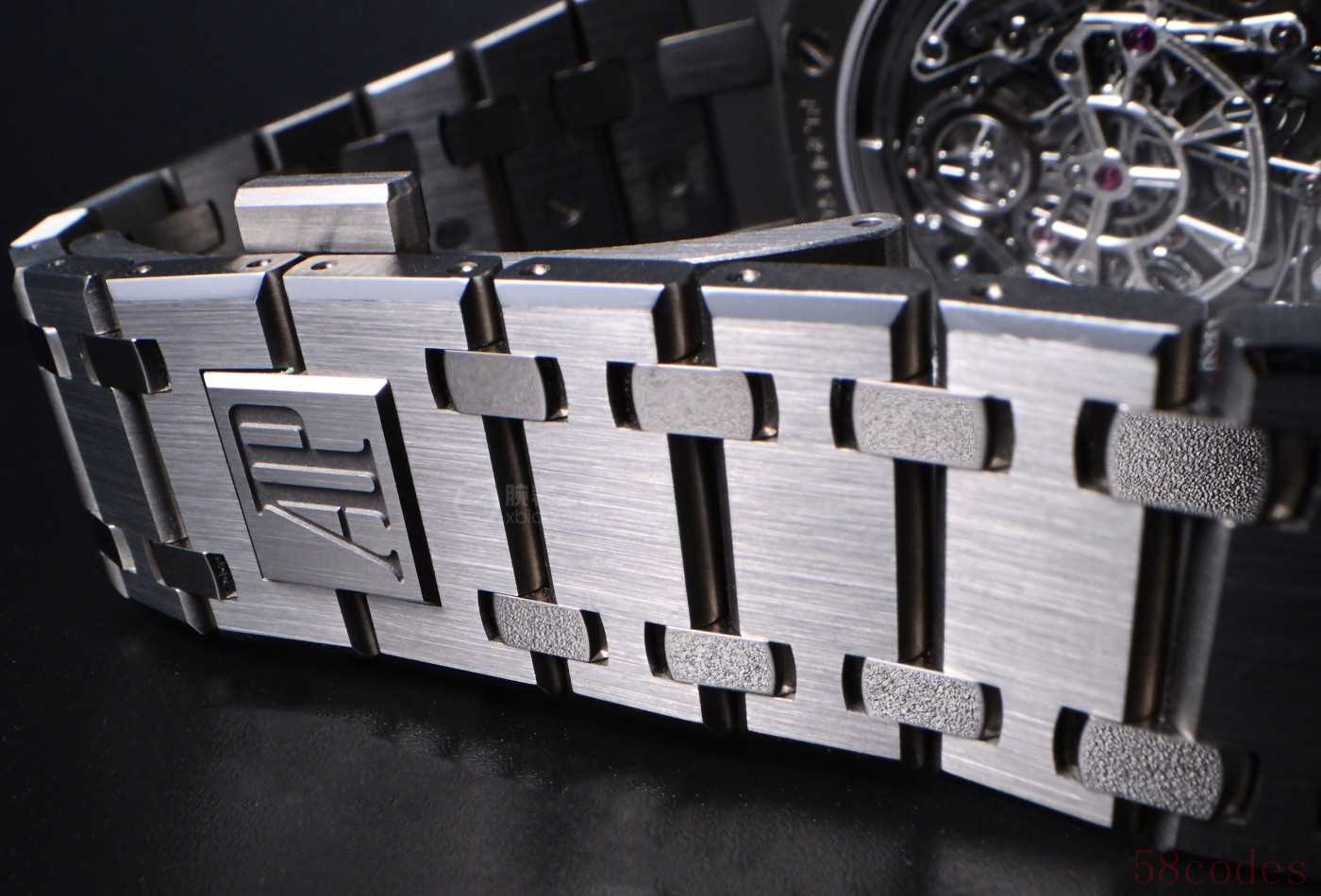 爱彼块状金属玻璃因为含了高于百分之五十的钯,所以光泽度有别于常规金属,偏向于铂金、白金的光亮感,跟钛金属拉丝表壳也形成了明暗对比,反倒是点亮了RD#5正面的视觉效果。