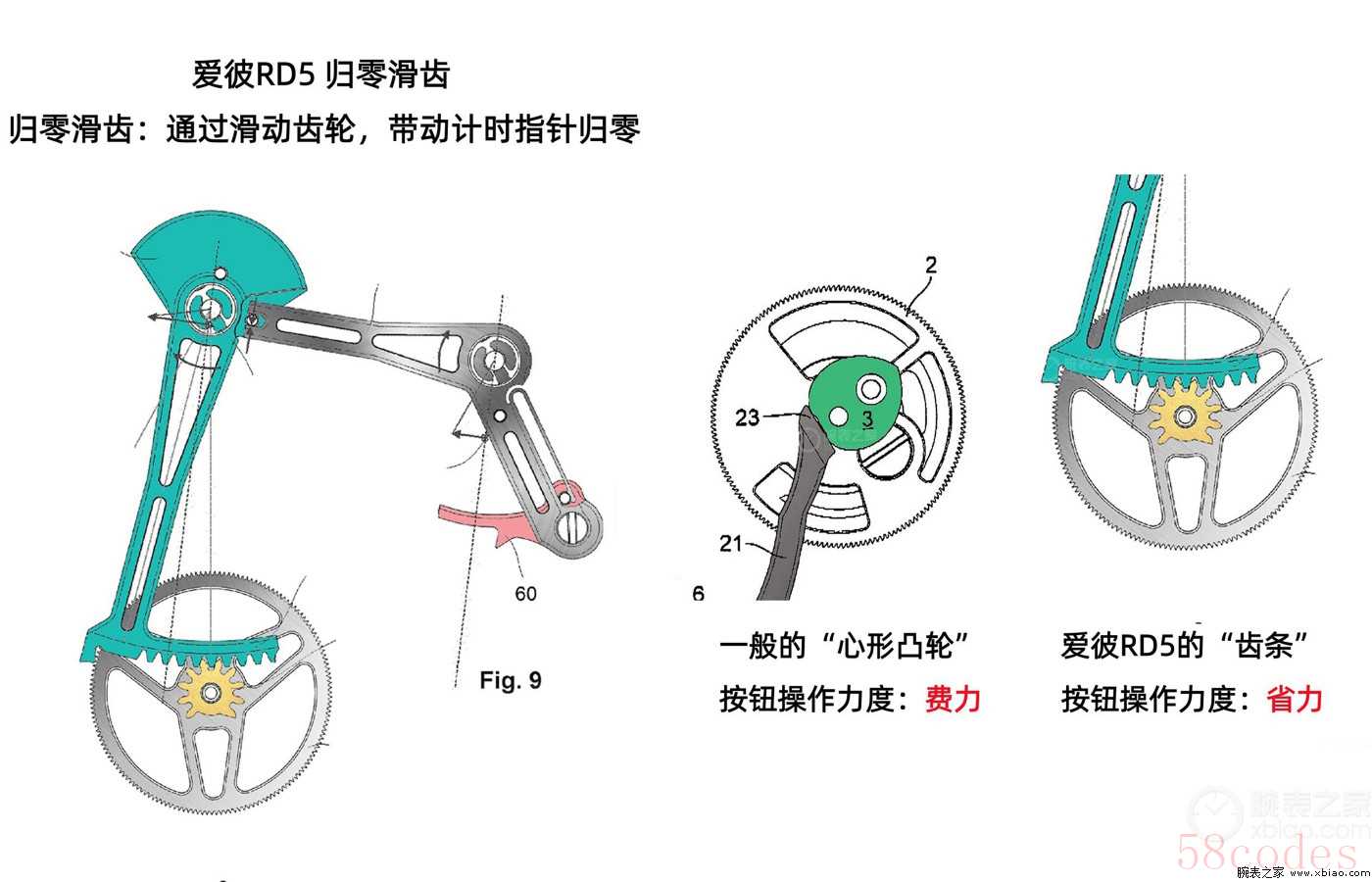传统计时表,通过心形凸轮结构来让计时指针归零,但心形凸轮多年来有一个小问题存在,就是按归零按钮的时候,归零锤杠杆得用点劲,才能推动桃心形状的凸轮。而心形凸轮是不规则造型,想要让它复位、带动计时指针归零,就得花更大的力,所以在按压传统计时表的归零键时,往往需要很大力气。
