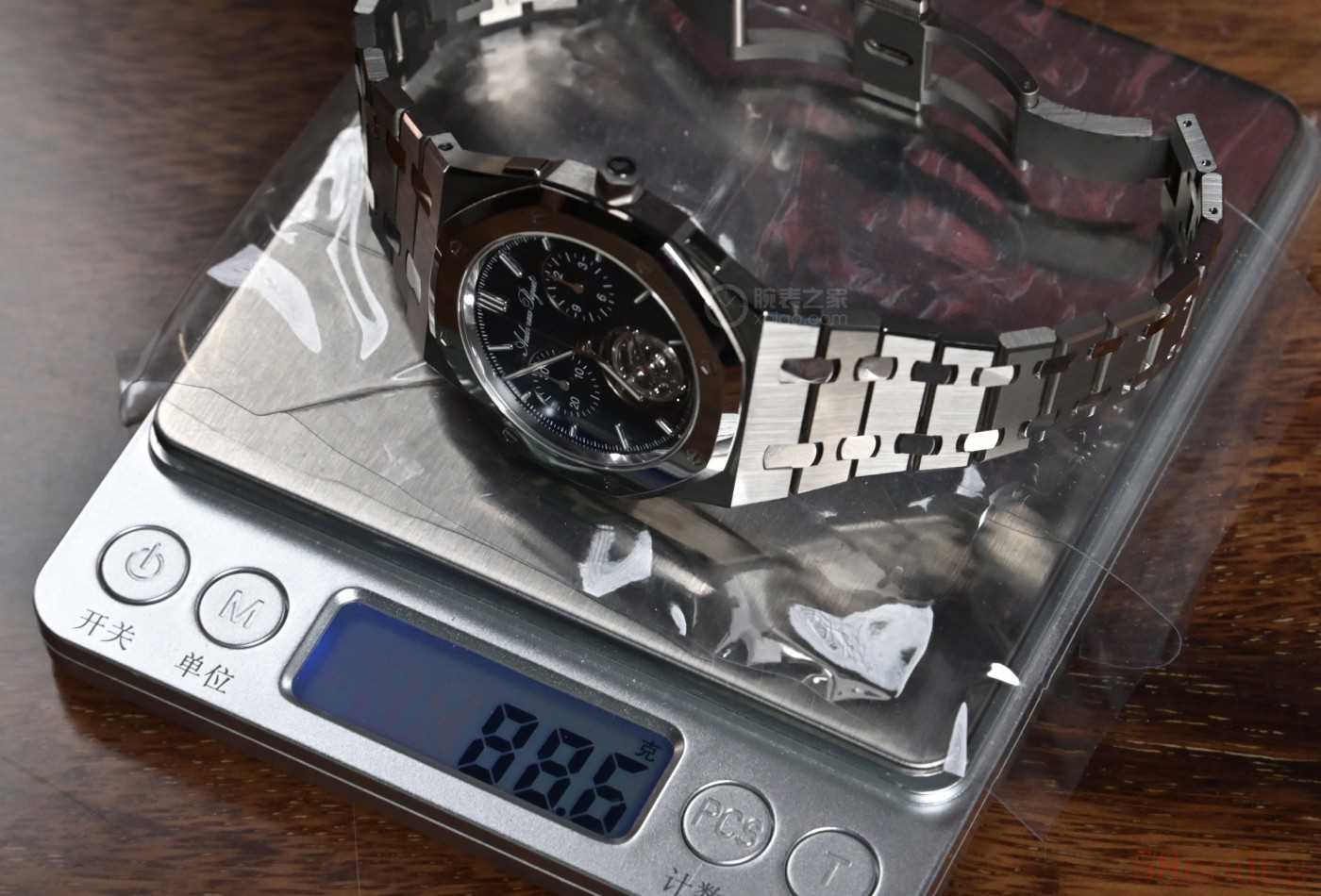 爱彼特别提供了一组计时按钮按压力度的数据作为对比:大多数计时码表的按钮,想要按动按钮一毫米,需使用约1.5公斤的力。各位表友在日常生活中接触过不少计时表,肯定也见过计时手感特别硬的,必须使劲攥着手指才能摁下去,那种费劲的感觉大家都懂。