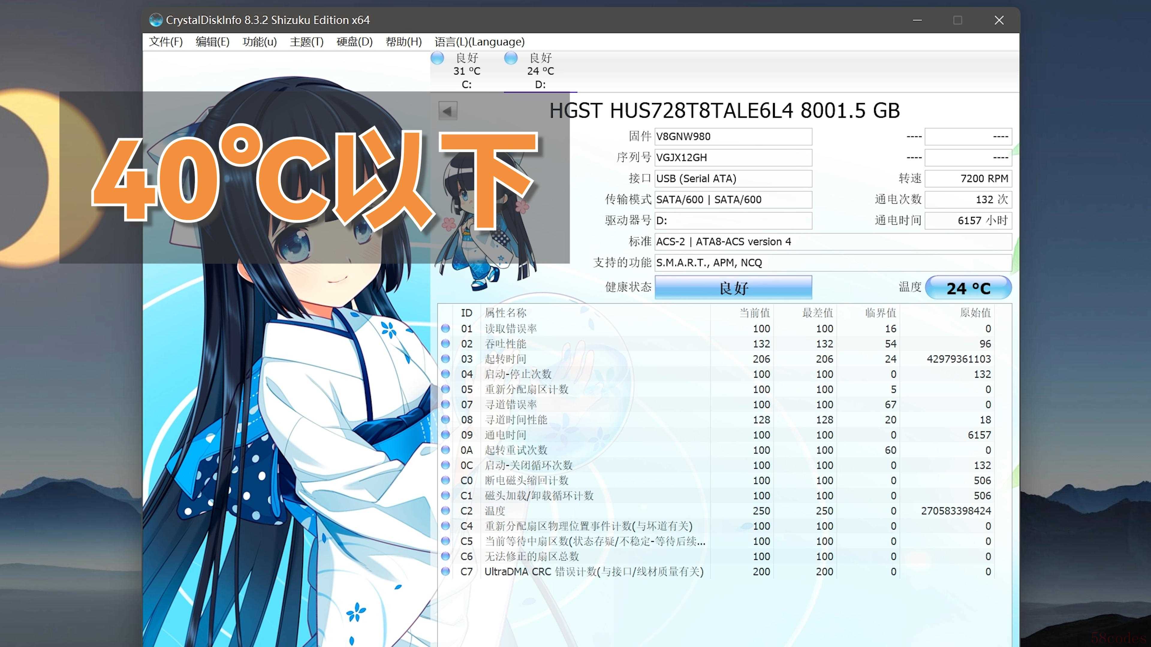 硬盘的工作温度同样在那张用户手册的PDF中,就在启动电流要求的下面几行。所以如果是企业级硬盘,并且在封闭的空间中,是很容易超过工作最高温度的。你可以使用CrystalDiskInfo这款工具,查看你硬盘的工作温度,建议让你的机械硬盘保持在40度以下。
