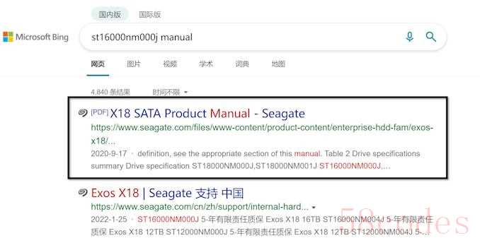 以希捷的银河16T为例,可以在微软必应的搜索中搜索“ST16000NM000J manual”,就能很轻松的找到硬盘详细的参数,有多详细呢,详细到看不懂的那种。