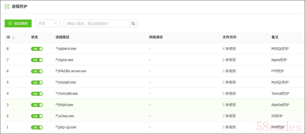 3、利用软件漏洞入侵防护办法常用的服务器软件几乎都有安全漏洞或危险功能,例如IIS、Apache、Nginx、Tomcat、SQL Server、MySQL、PHP等等。对于软件漏洞问题,除了更新官方安全补丁,还应该做一些防护措施,毕竟先有漏洞后有补丁。不花钱的防护措施是对软件降权,使用低权限账户运行(例如guests),这样黑客就没法利用软件漏洞提权入侵服务器。不过降权操作有些复杂、繁琐,效果也比较有限。如果黑客只是篡改网站而不入侵服务器,就很难防护。建议部署专业的安全软件进行防护,推荐使用《护卫神.防入侵系统》,使用“进程防护”模块(默认已经内置常用软件的防护规则,如下图三),限制软件的网络通信范围和文件访问范围,禁止越权访问文件,阻止利用cmd.exe、net.exe提权。同时再使用篡改防护模块,对网站文件做防篡改保护,拦截黑客篡改网站。