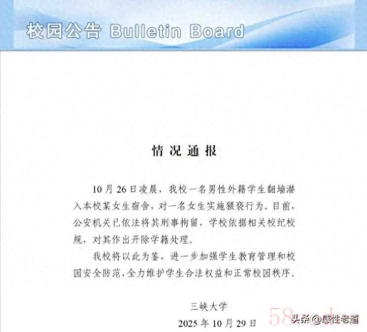 凌晨两点的攀爬声打破校园宁静,外籍学生徒手沿管道侵入女生宿舍,受害者在反抗中被击打面部,整栋楼被呼救声惊醒——三峡大学南苑公寓的惊魂一幕,最终以涉事者被刑拘、学校作出开除学籍处理暂告段落 。但校方通报中"加强管理""维护秩序"的笼统表述,难以掩盖事件暴露出的安全防护失效、涉外管理缺位等深层问题。