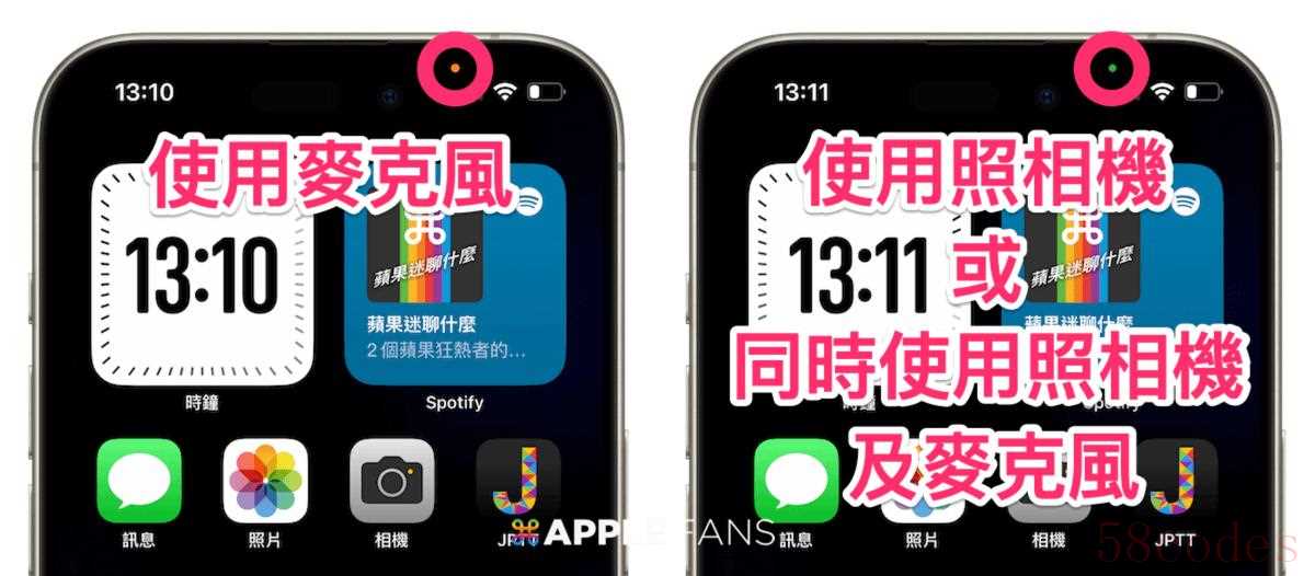 在iOS 14 及以上版本中,iPhone 萤幕上方状态列会以不同颜色的小圆点,显示是否有App 在使用你的相机或麦克风。- 如果有显示橘色小圆点,表示iPhone 正在使用麦克风。如果有显示绿色小圆点,表示iPhone 正在使用相机,或者正同时使用相机和麦克风。