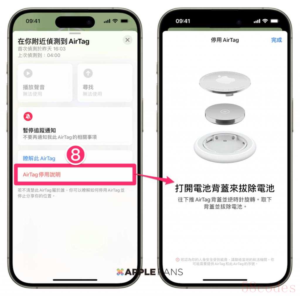 - 如果确认是未知的AirTag,可以点【AirTag 停用说明】,就会进入「拔除电池」的教学页面。