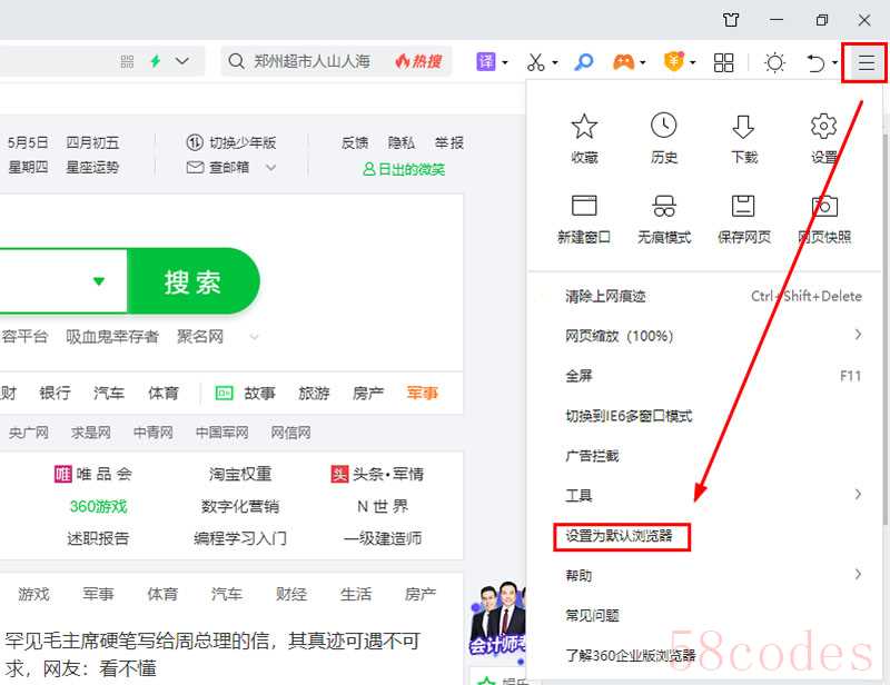 (1)打开360安全浏览器,点击右上角的菜单,点击“设置为默认浏览器”,就可以了。