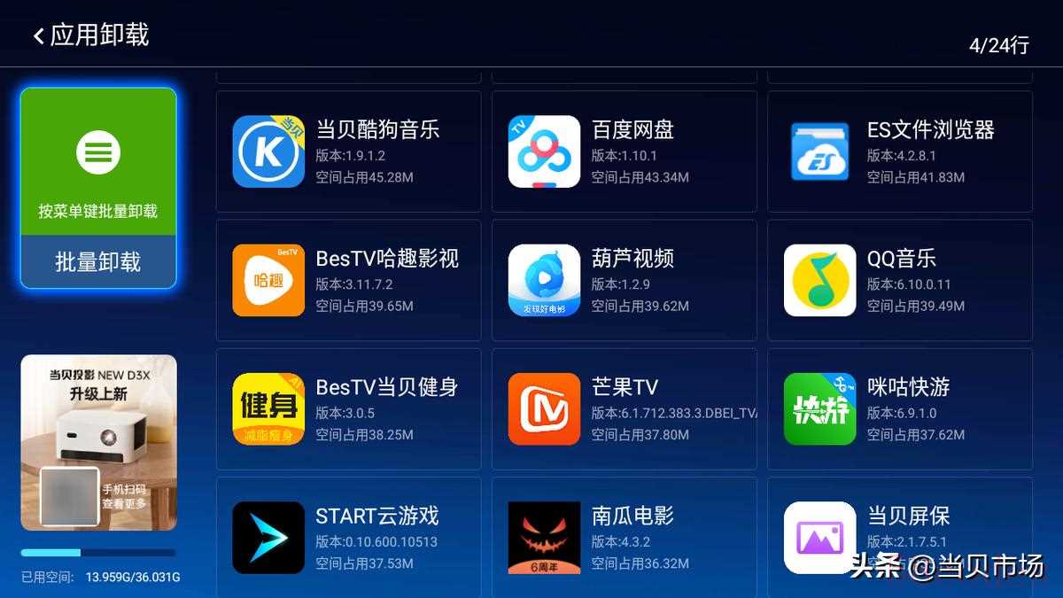 当贝市场的软件卸载功能更清楚明了,支持同时卸载多个软件。