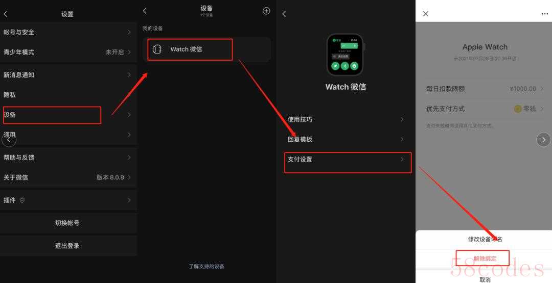 点击设置 - 设备 - Watch 微信 - 支付设置,再点击右上角三个小圆点,就可以进行解绑了;