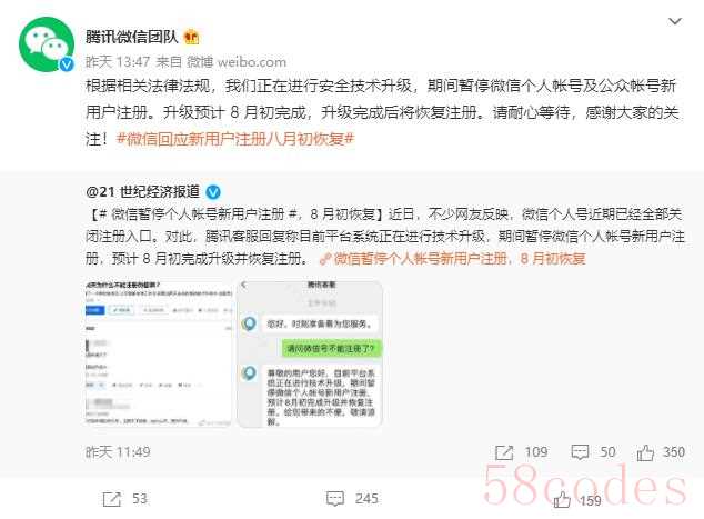 就在昨天,网传截图显示,微信暂停个人帐号新用户注册。