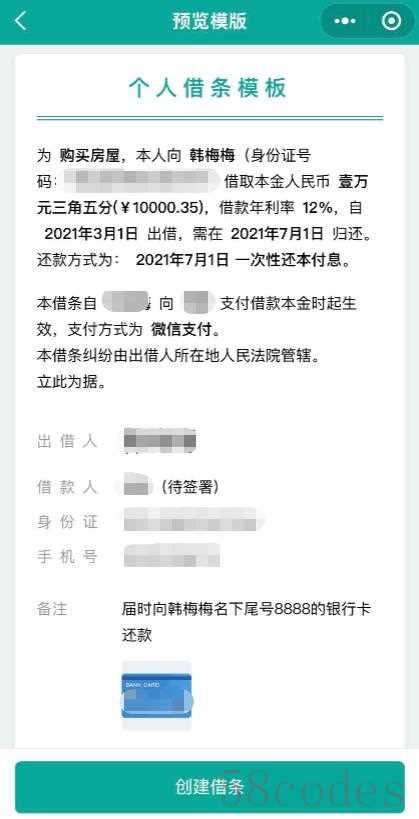 当然,出借人、借款人都可以使用这个小借条,同时身份信息包含:姓名、身份证号、手机号;