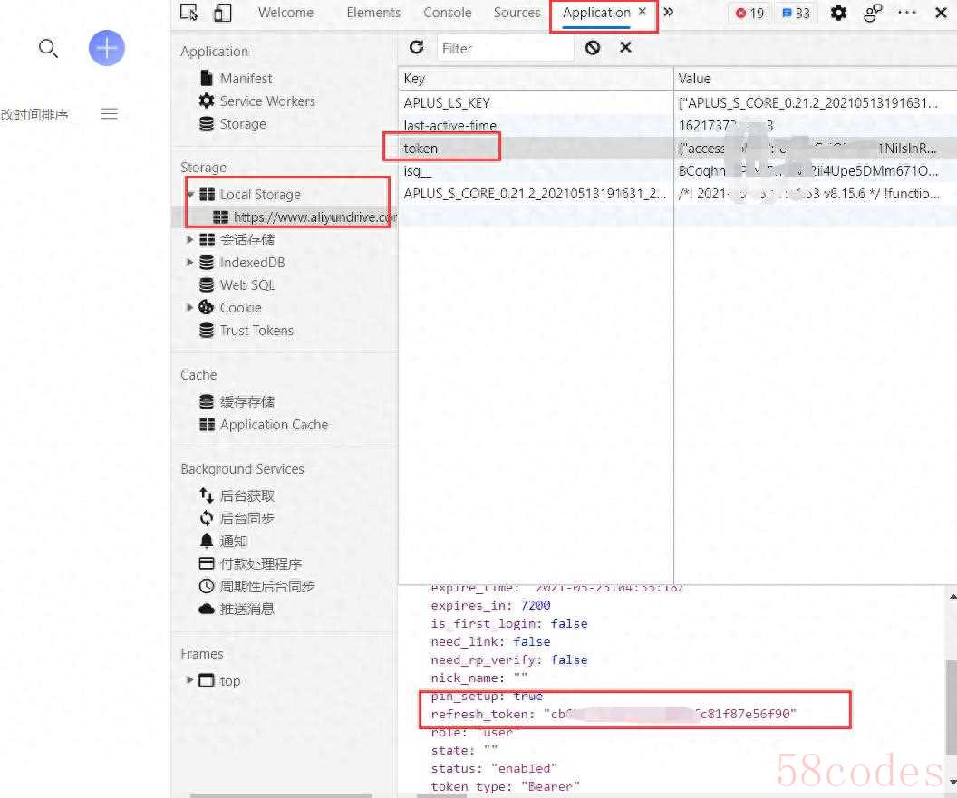 - 登录成功后,按F12打开开发者工具,点击Application,点击Local Storage,点击 Local Storage下的https://www.aliyundrive.com/,点击右边的token,此时可以看到里面的数据,其中就有refresh_token,把其值复制出来即可。(格式为小写字母和数字,不要复制双引号。例子:ca6bf2175d73as2188efg81f87e55f11)