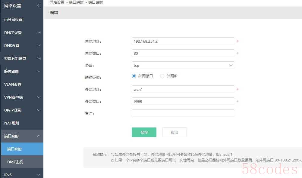 外网地址:当映射类型选择外网接口外网地址选择有公网IP的外网网口。当映射类型选择外网IP时外网地址填写公网IP地址。