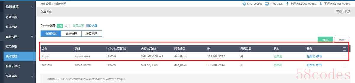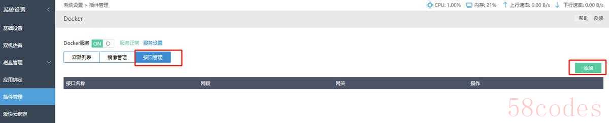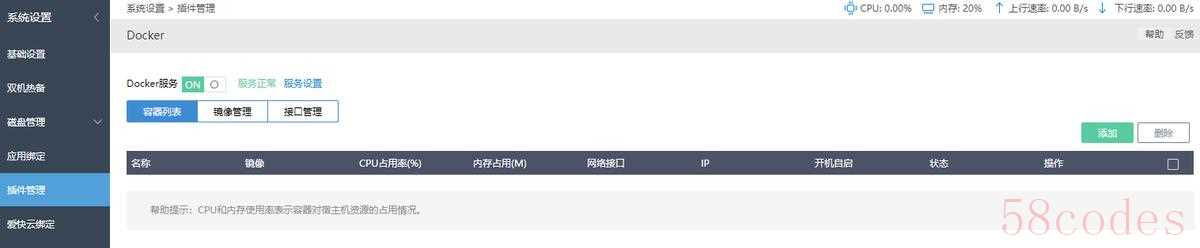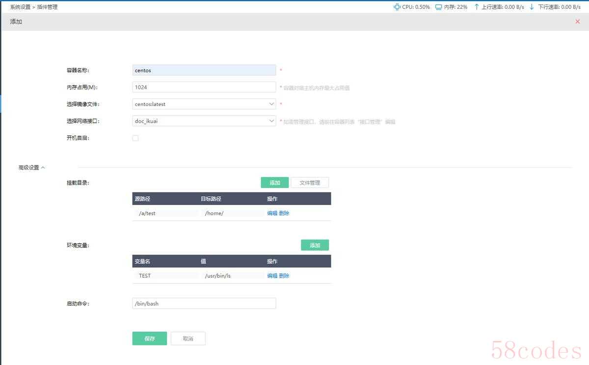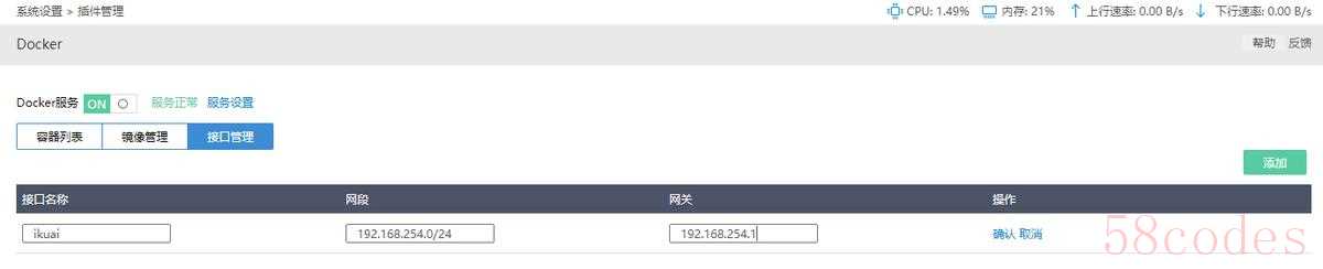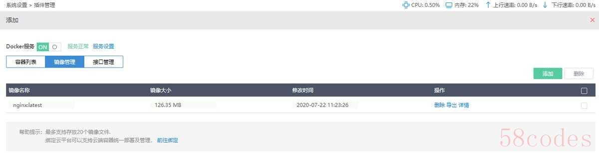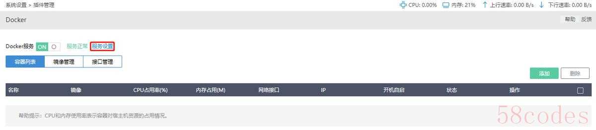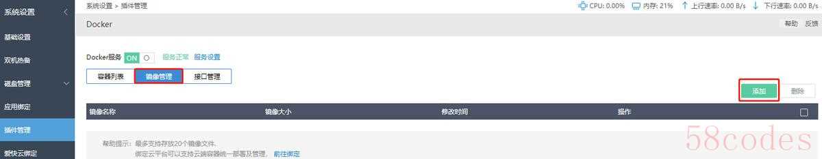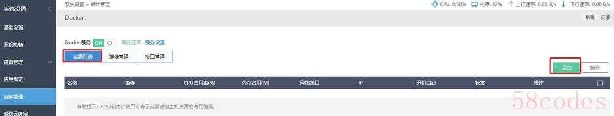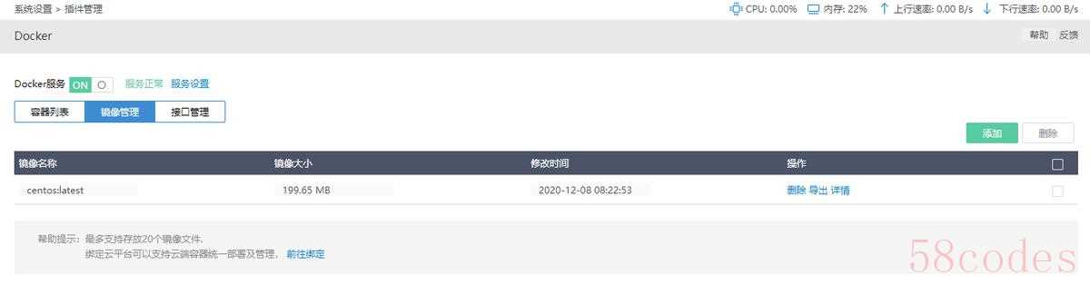 需要先在接口管理里添加接口,然后在镜像管理里添加镜像文件,最后再去容器列表里添加容器,下面以添加centos容器为例介绍每个功能的详细设置过程: