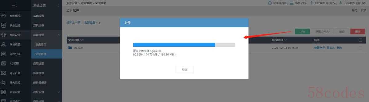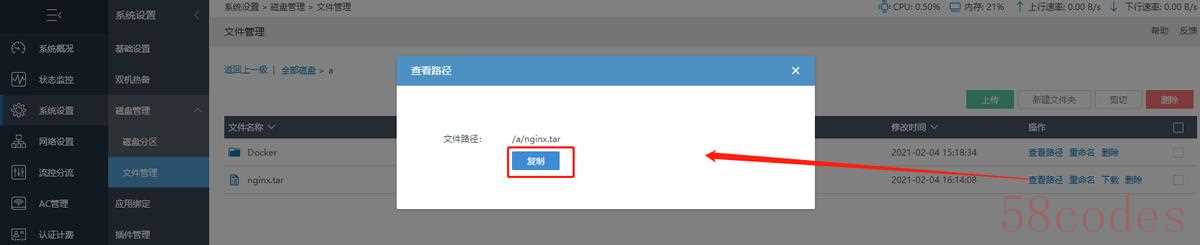 挂载目录:可将路由磁盘管理-文件管理里的文件目录直接挂载到容器里的目录下。在路由文件管理里上传文件,会同步到容器里目标目录下。源路径填写路由文件管理中目录路径,目标路径填写容器里的目录路径。