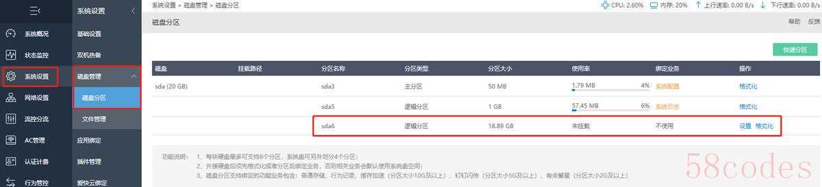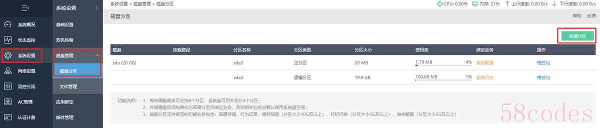 点击前往设置跳转到系统设置--磁盘管理--磁盘分区,如果没有可设置普通存储磁盘可先进行快速分区后设置磁盘为普通存储。分区后需重启路由生效。给磁盘绑定业务将格式化磁盘需要谨慎处理。
